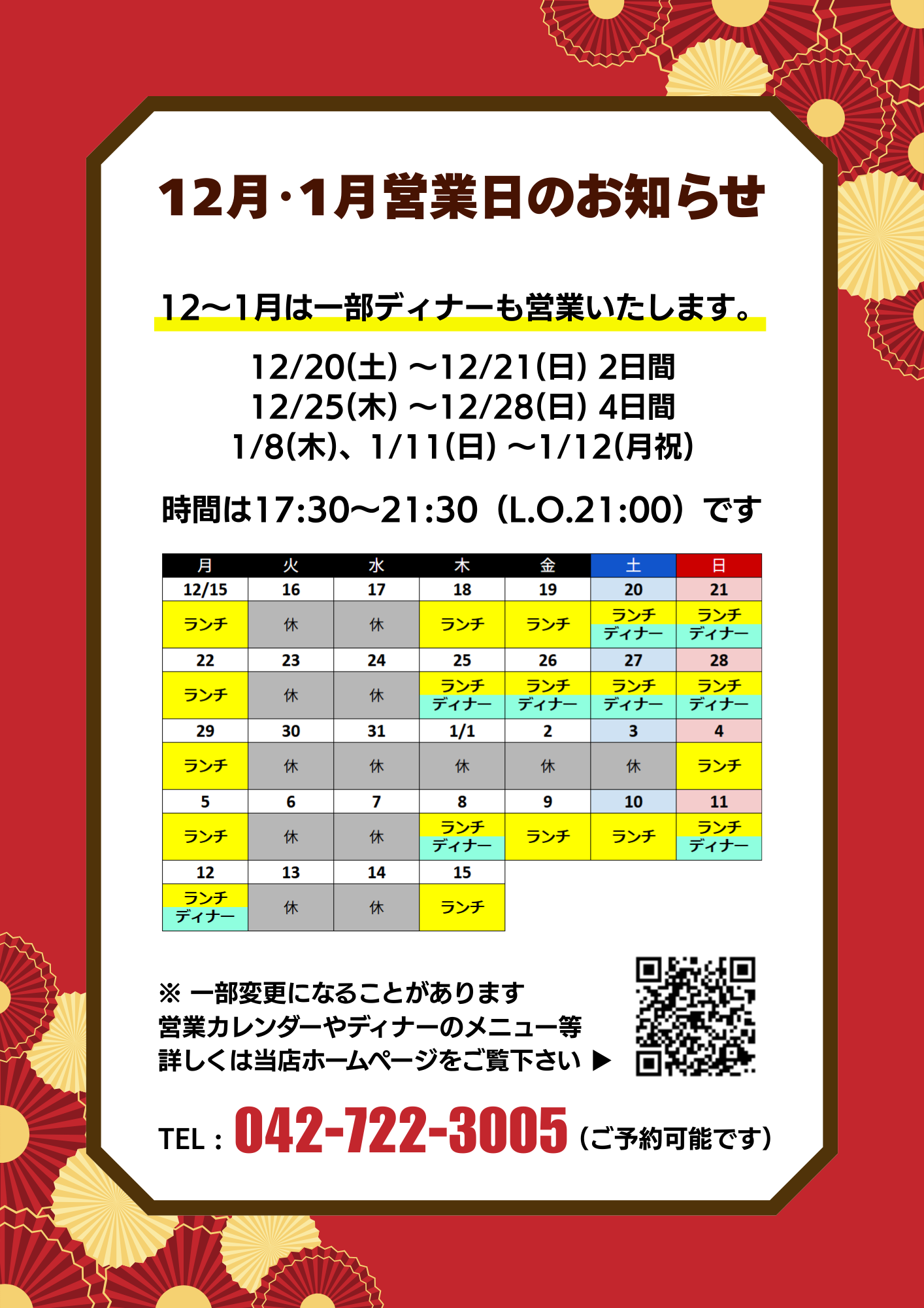 12月は6日間限定でディナー営業いたします。 12/20(土)~12/21(日)2日間 12/25(木)~12/28(日)4日間 時間は17:30~21:30(L.O.21:00)、計6日間の営業となります。 【営業カレ …