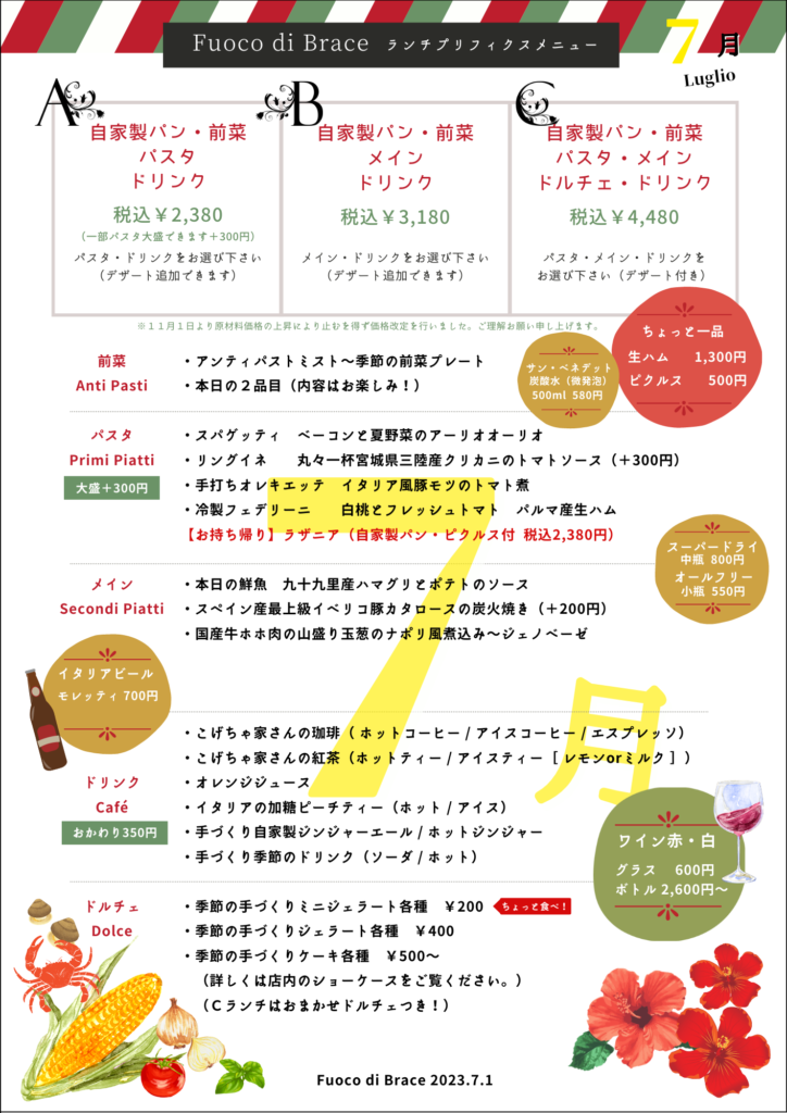 今月は夏野菜パスタや蟹パスタのほか、人気の手打ちオレキエッテが久々の登場です♪
