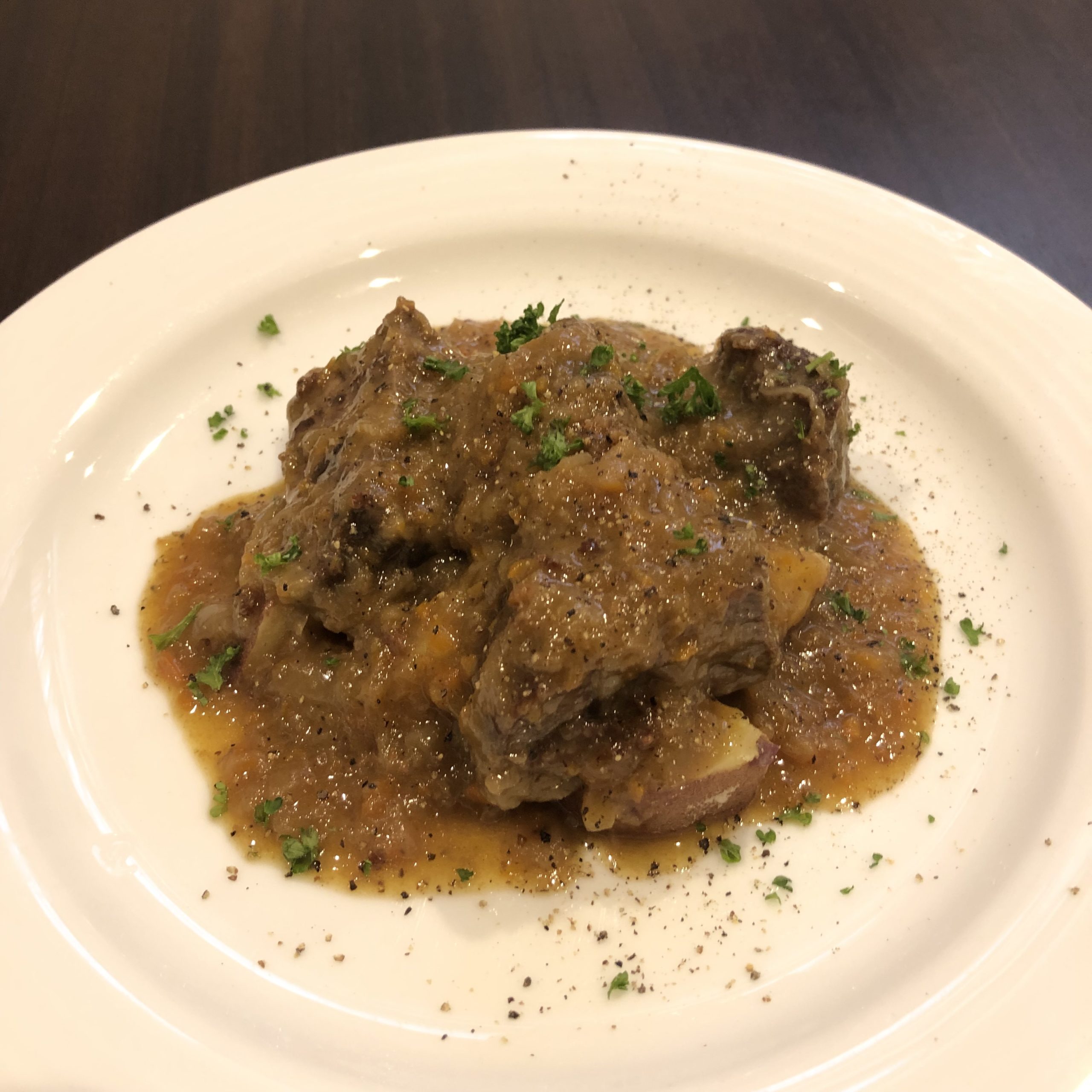 ▼国産牛ホホ肉の山盛り玉葱のナポリ風煮込み~ジェノベーゼ