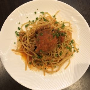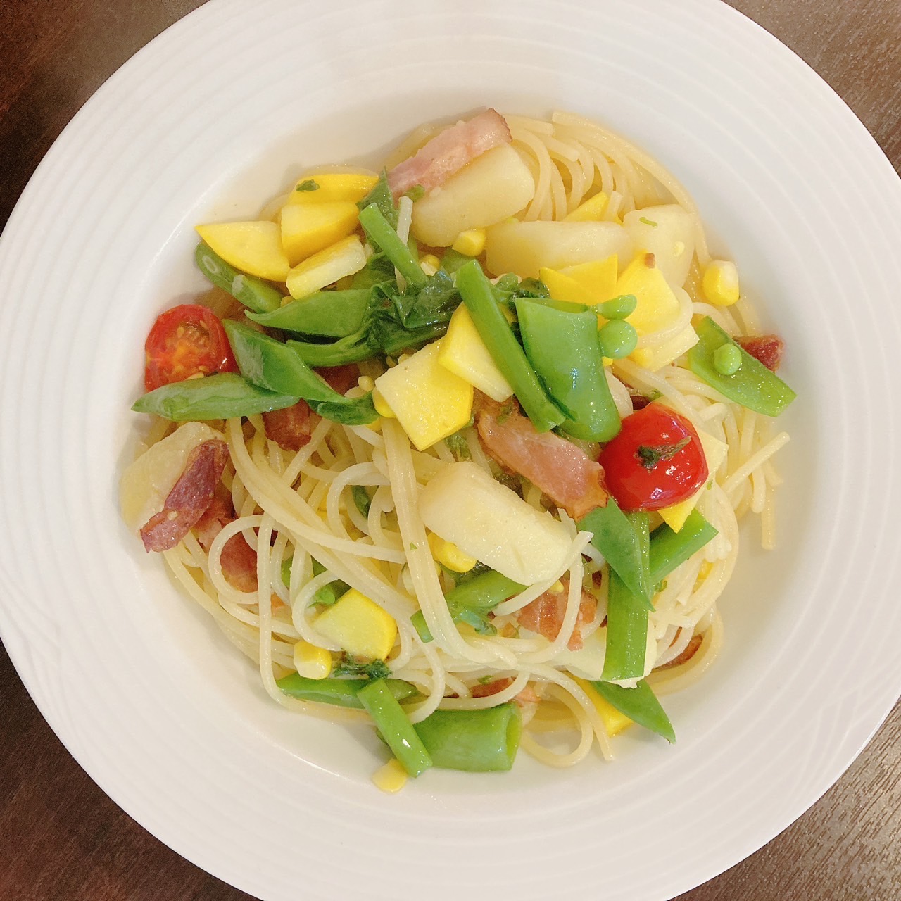 まず、トウモロコシやトマトなど夏野菜をたっぷり使ったスパゲッティ【ベーコンと夏野菜のアーリオオーリオ】。