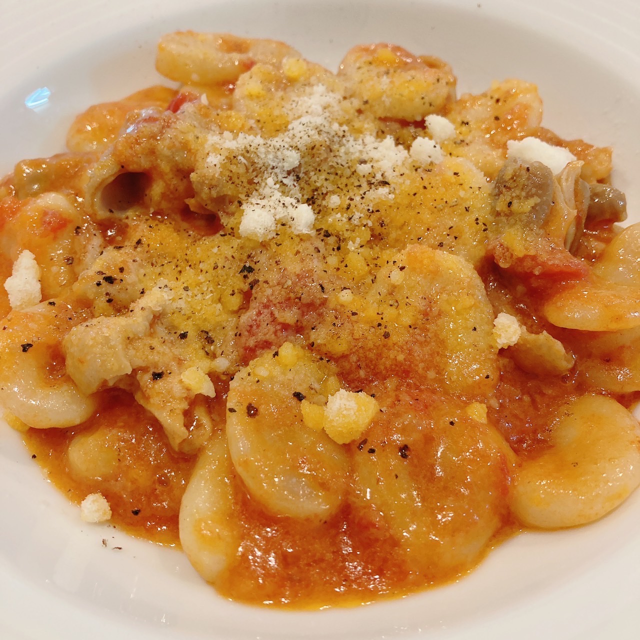 ▼手打ちオレキエッテ イタリア風豚モツのトマト煮