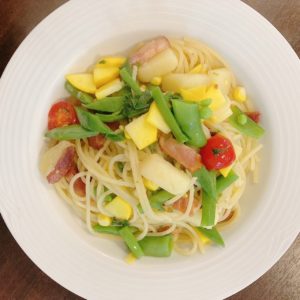 ▼スパゲッティ ベーコンと夏野菜のアーリオオーリオ