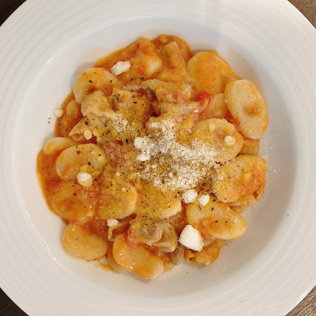 また、隠れリピーターの多いシェフ仕込みの耳たぶパスタ、オレキエッテを使った【手打ちオレキエッテ イタリア風豚モツのトマト煮】もご用意。