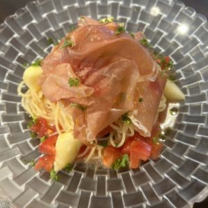 ▼冷製フェデリーニ 白桃とフレッシュトマト パルマ産生ハム