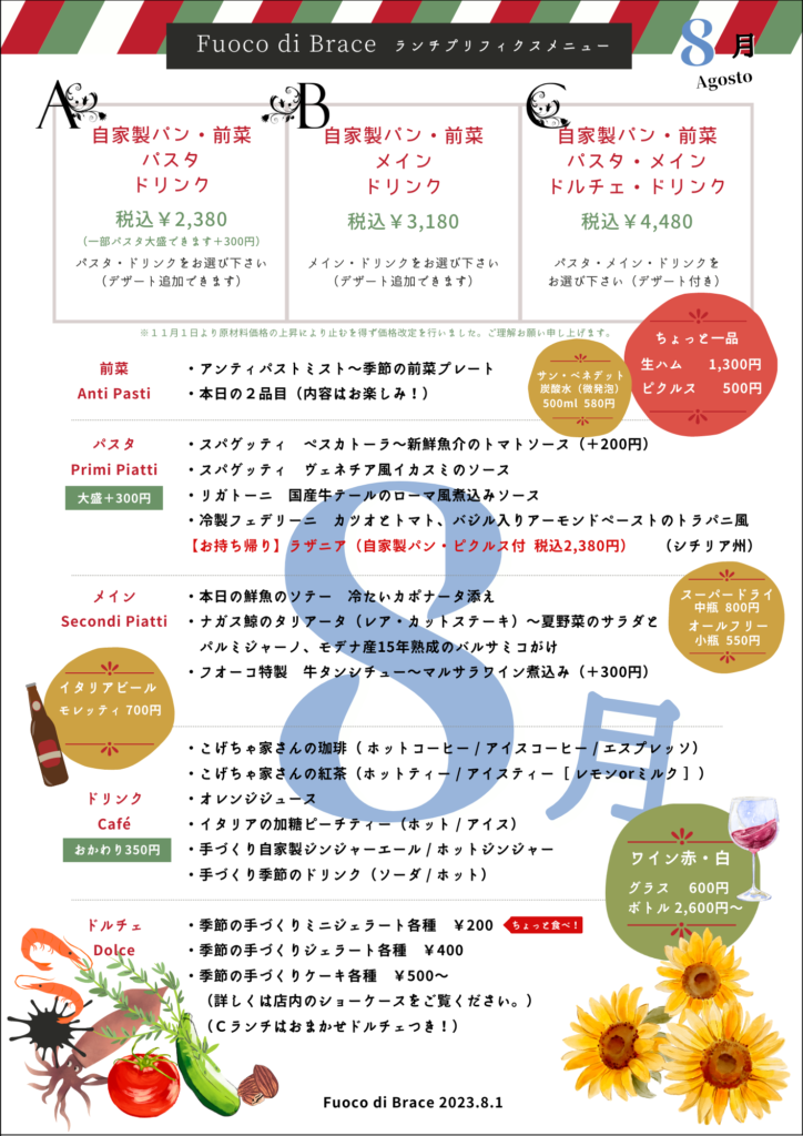 8月lunchプリフィクスメニューのお知らせです。