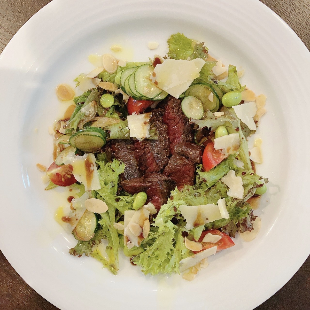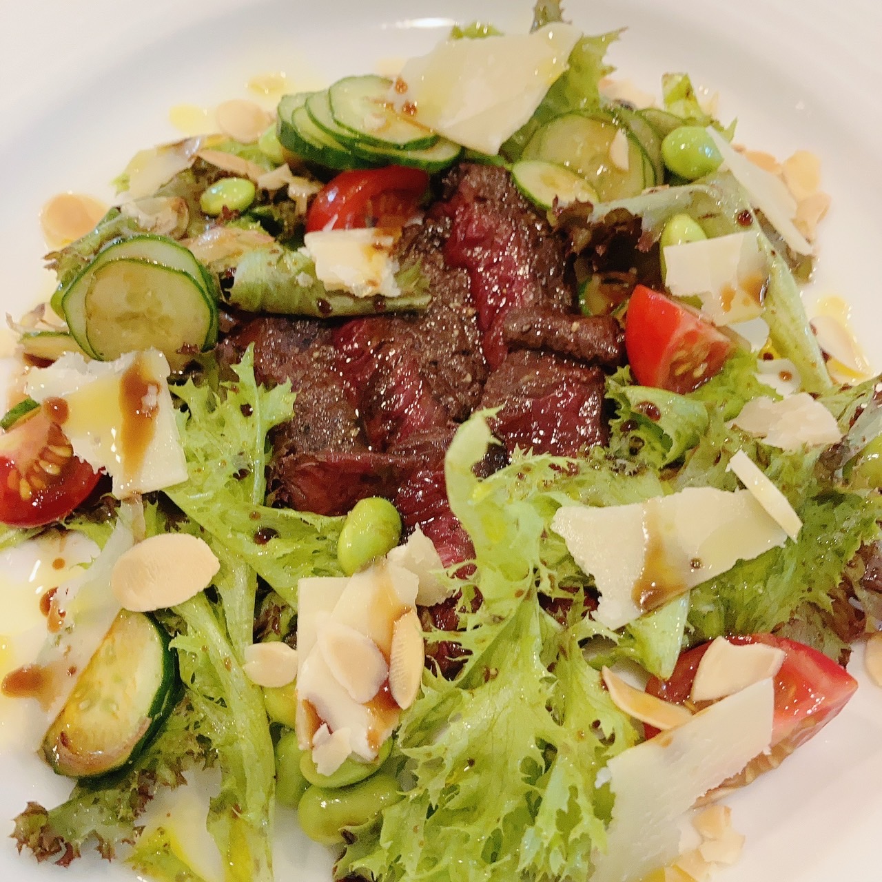 ▼ナガス鯨のタリアータ(レア・カットステーキ)~夏野菜のサラダとパルミジャーノ、モデナ産15年熟成のバルサミコがけ