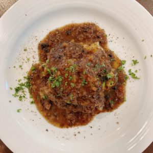 トスカーナ地方の伝統的な煮込み。元はレンガ職人がレンガを焼いている釜の端っこに安いスネ肉と赤ワイン、臭み消しに黒胡椒をたっぷり入れたテラコッタを入れて置いて仕事が終わった後にワインとパンで食べていたのが発祥。