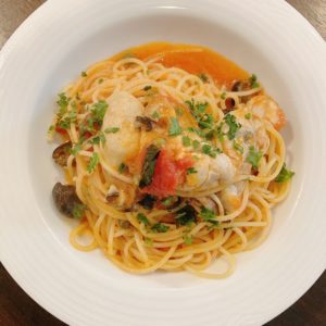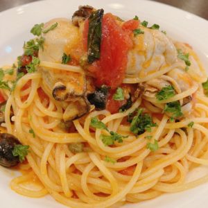 広島県倉橋島産大粒牡蠣を贅沢に使ったトマトソースのスパゲッティ。