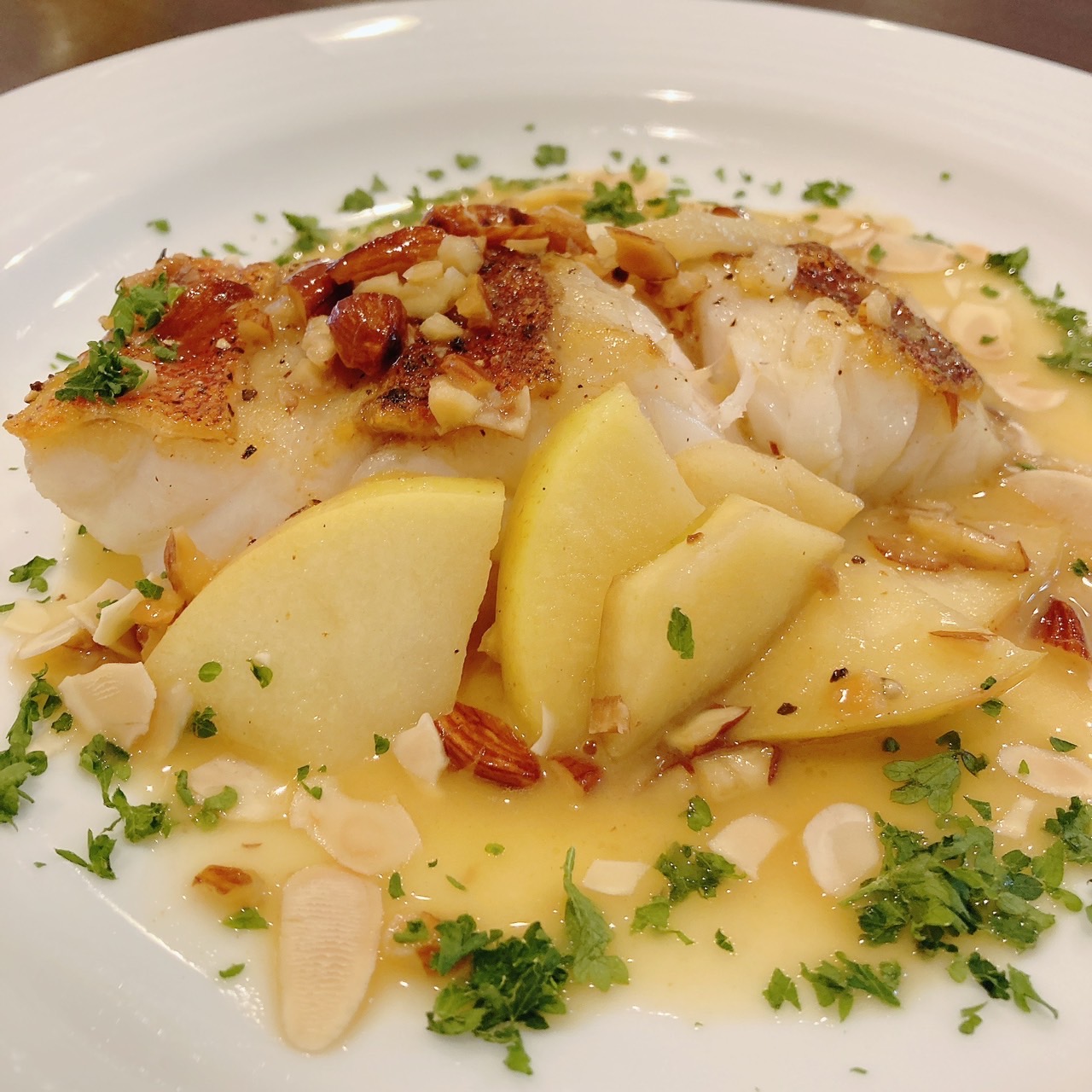 ▼本日の鮮魚のソテー リンゴとアーモンドのソース~カルヴァドス風味