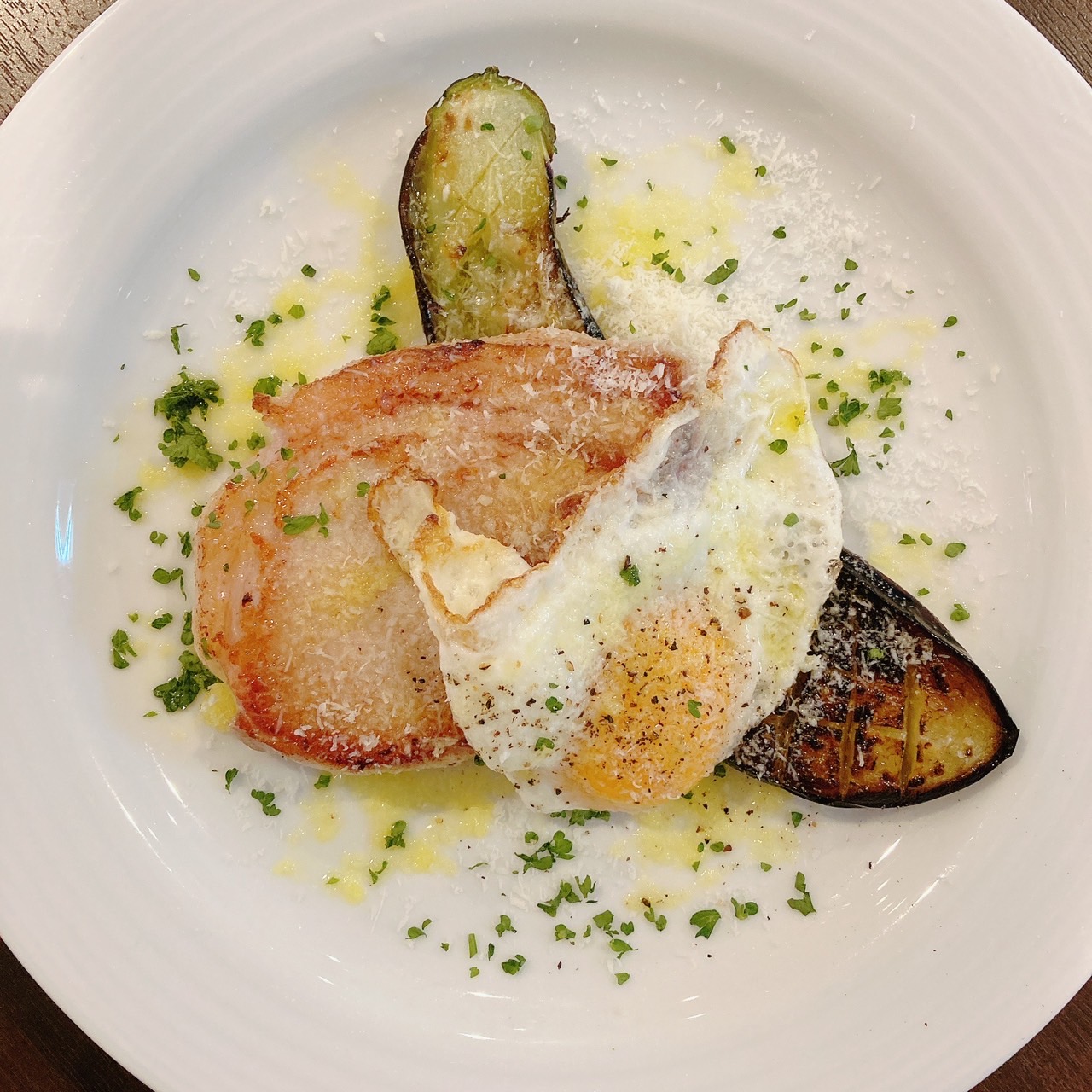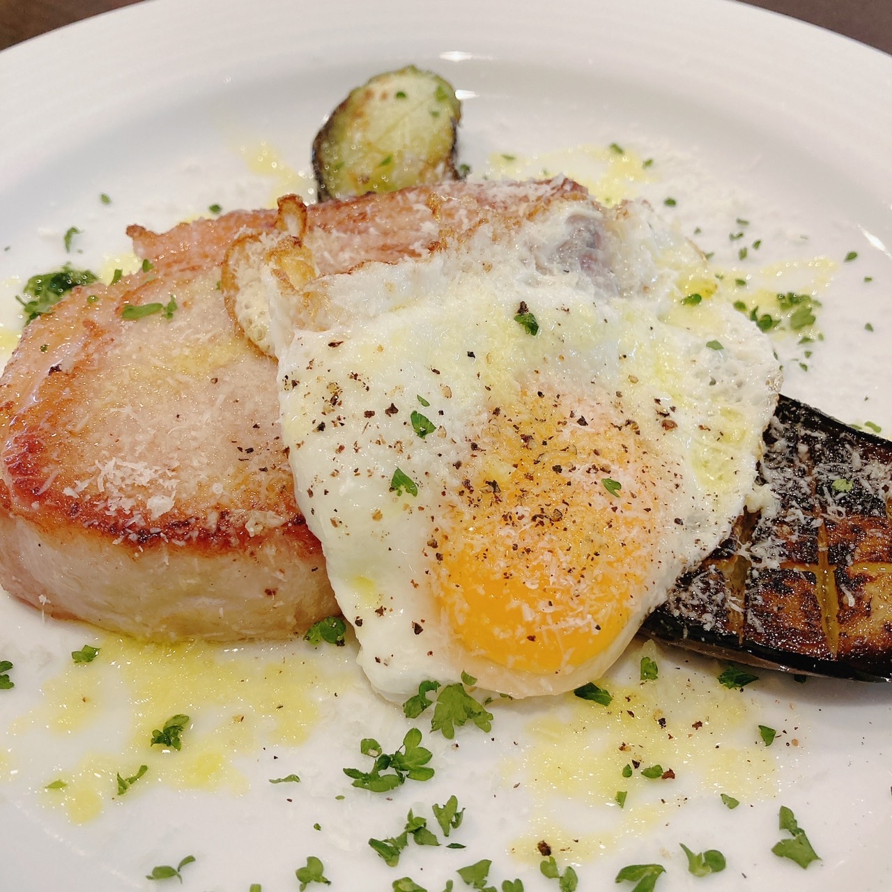 ▼自家製ロースハムと秋ナスのソテー~半熟目玉焼きとペコリーノチーズ