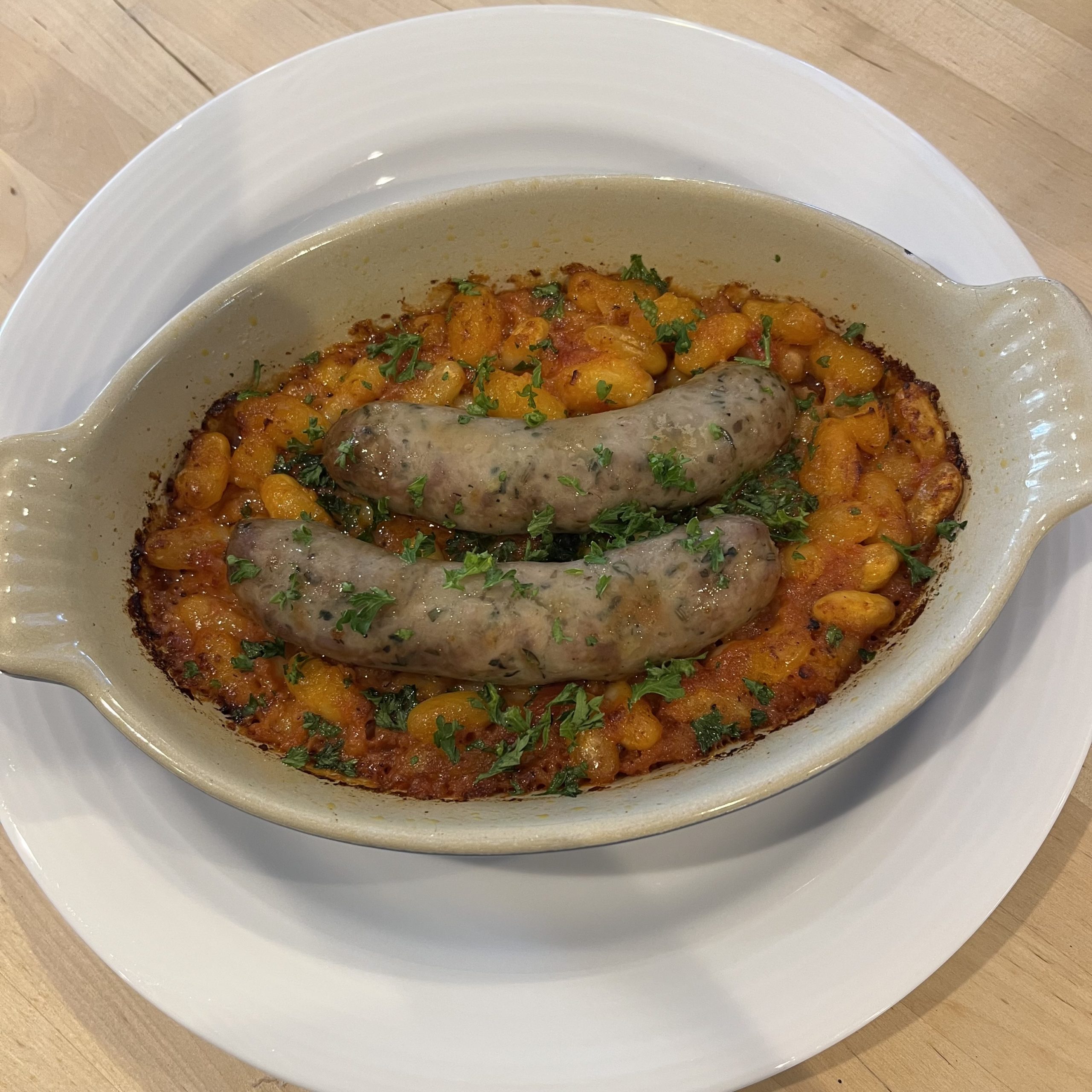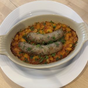 ▼スペイン産ガリシア栗豚100%の自家製生ソーセージと白いんげん豆のオーブン焼き