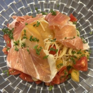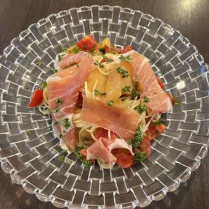 フルーツトマトの酸味と甘味、香り高い旬の桃、生ハムの塩気、最高のバランスで美味。今シーズン最後の冷製パスタ。