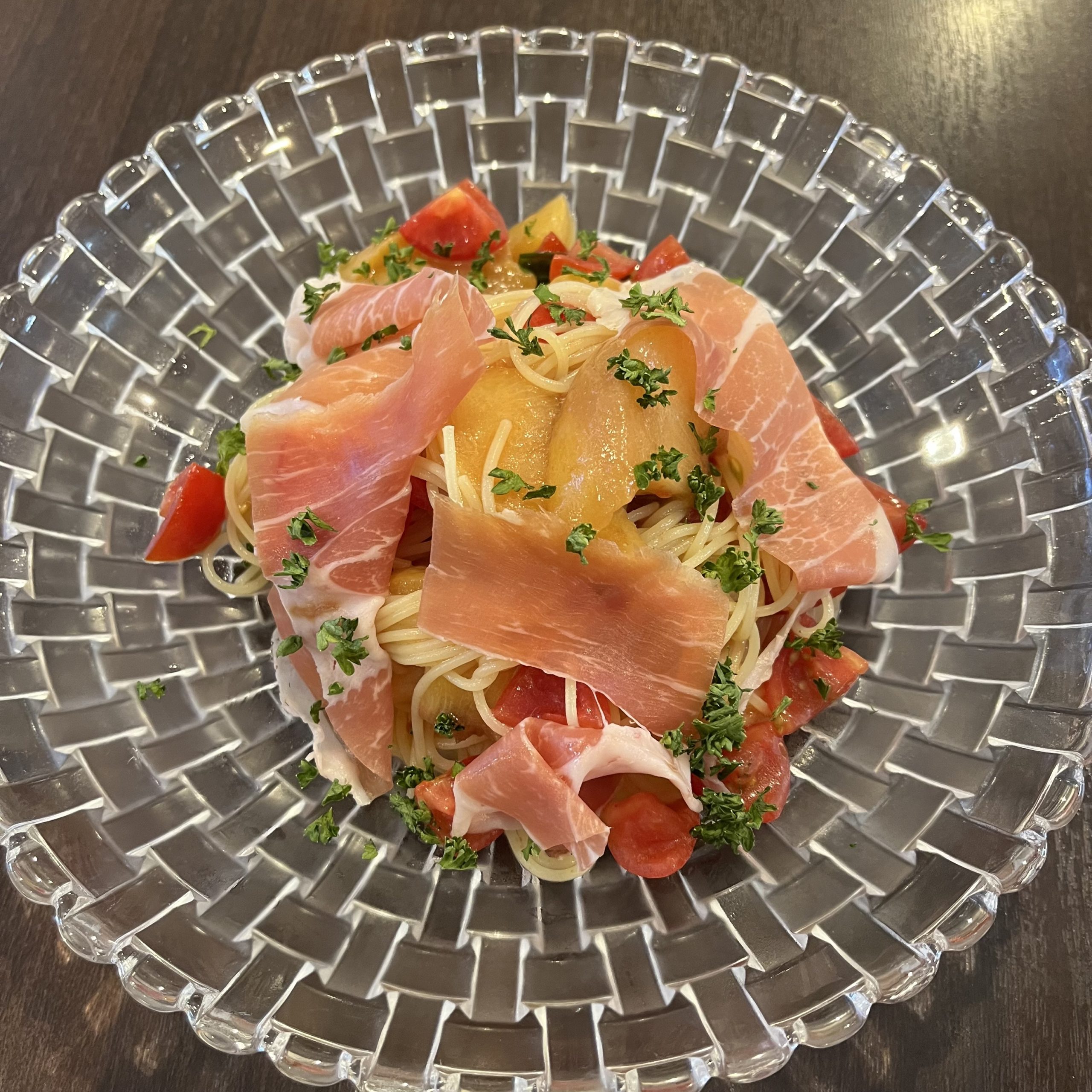 ▼冷製フェデリーニ フルーツトマトと白桃、パルマ産生ハムのせ[+300円]