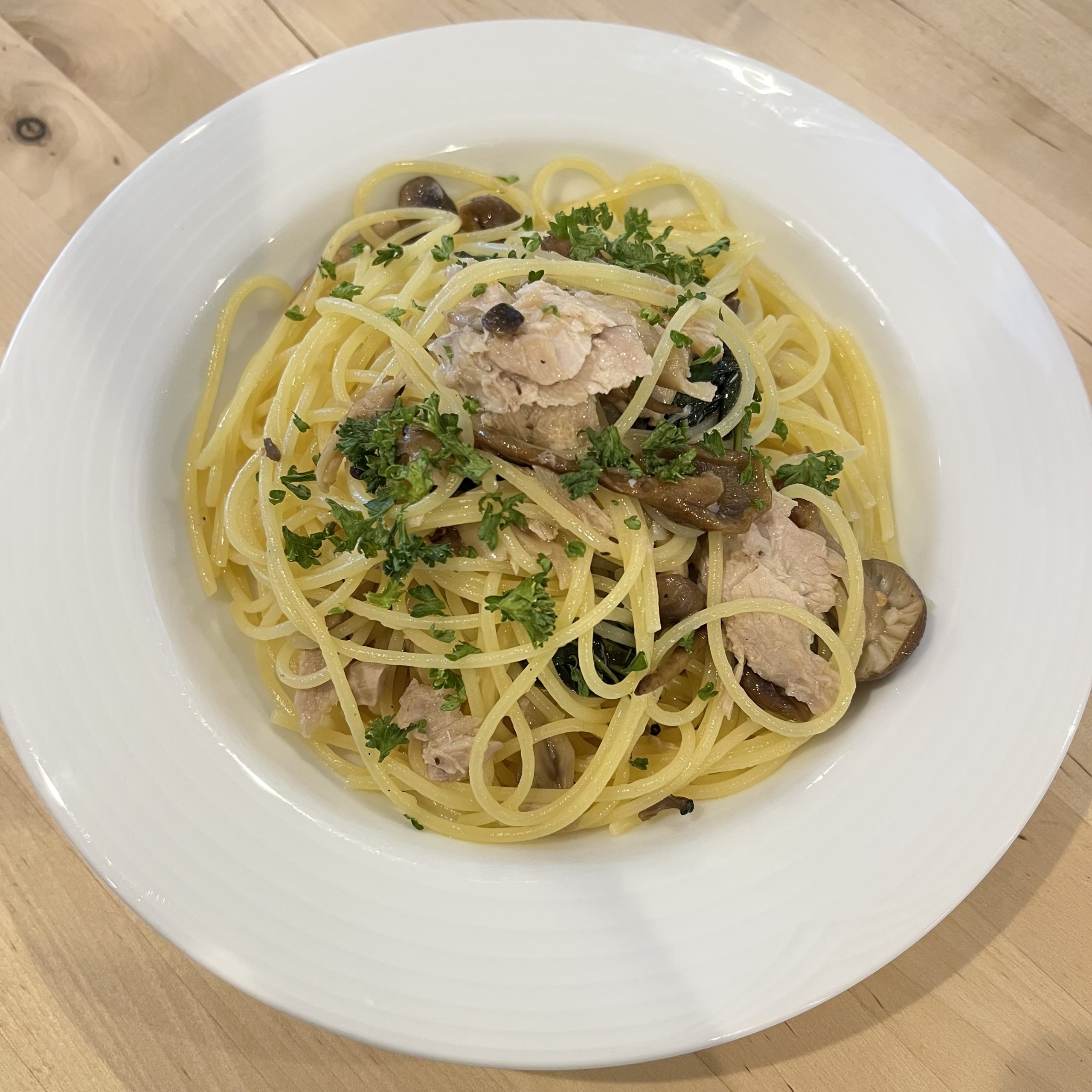 ▼スパゲティ 自家製キハダマグロのオイル漬けと色々きのこの木こり風