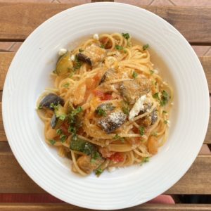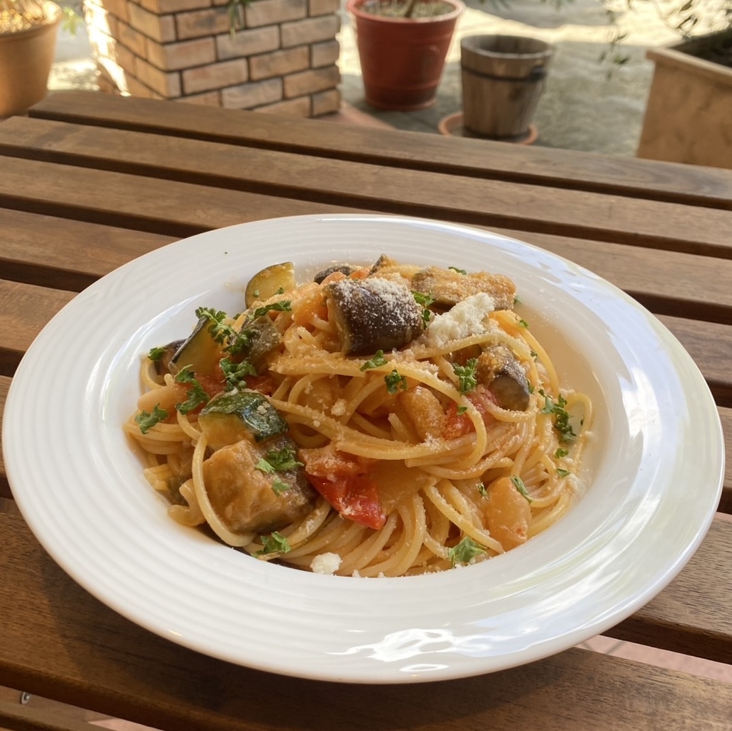 ▼スパゲティ 夏野菜たっぷりの菜園風トマトソース