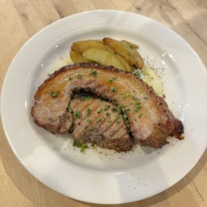 スペイン産の皮付きバラ肉で高座豚のモモ肉、たっぷりの香草を巻き込んだイタリア全土で良く食べられているローストポークの一種。肉の塊なのでお腹を空かせてからの注文必須。