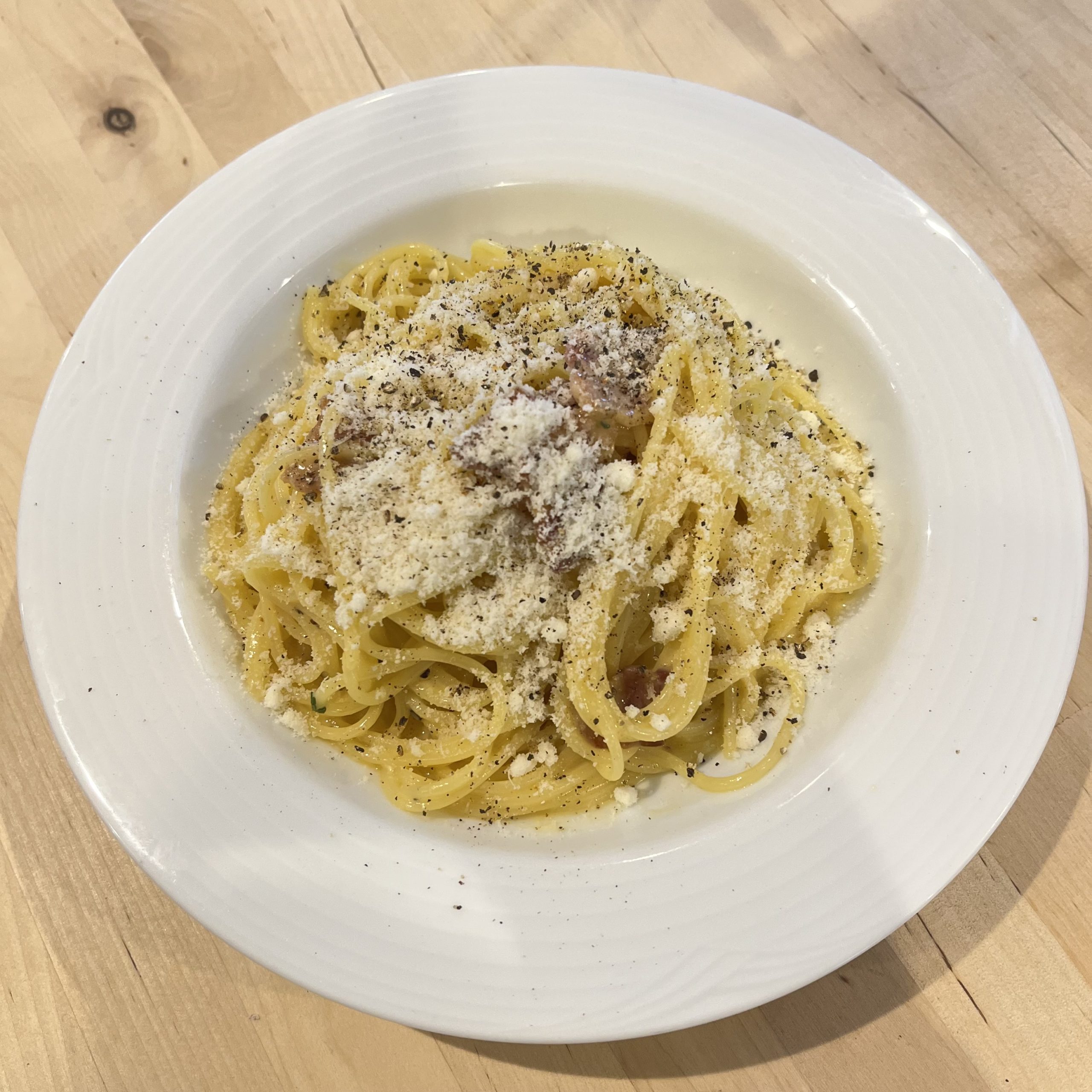 ご好評いただいている当店のカルボナーラの登場。パンチェッタは仕上がるまで約2ヶ月程かかる自家製。生クリームは使わない本場のカルボナーラ。