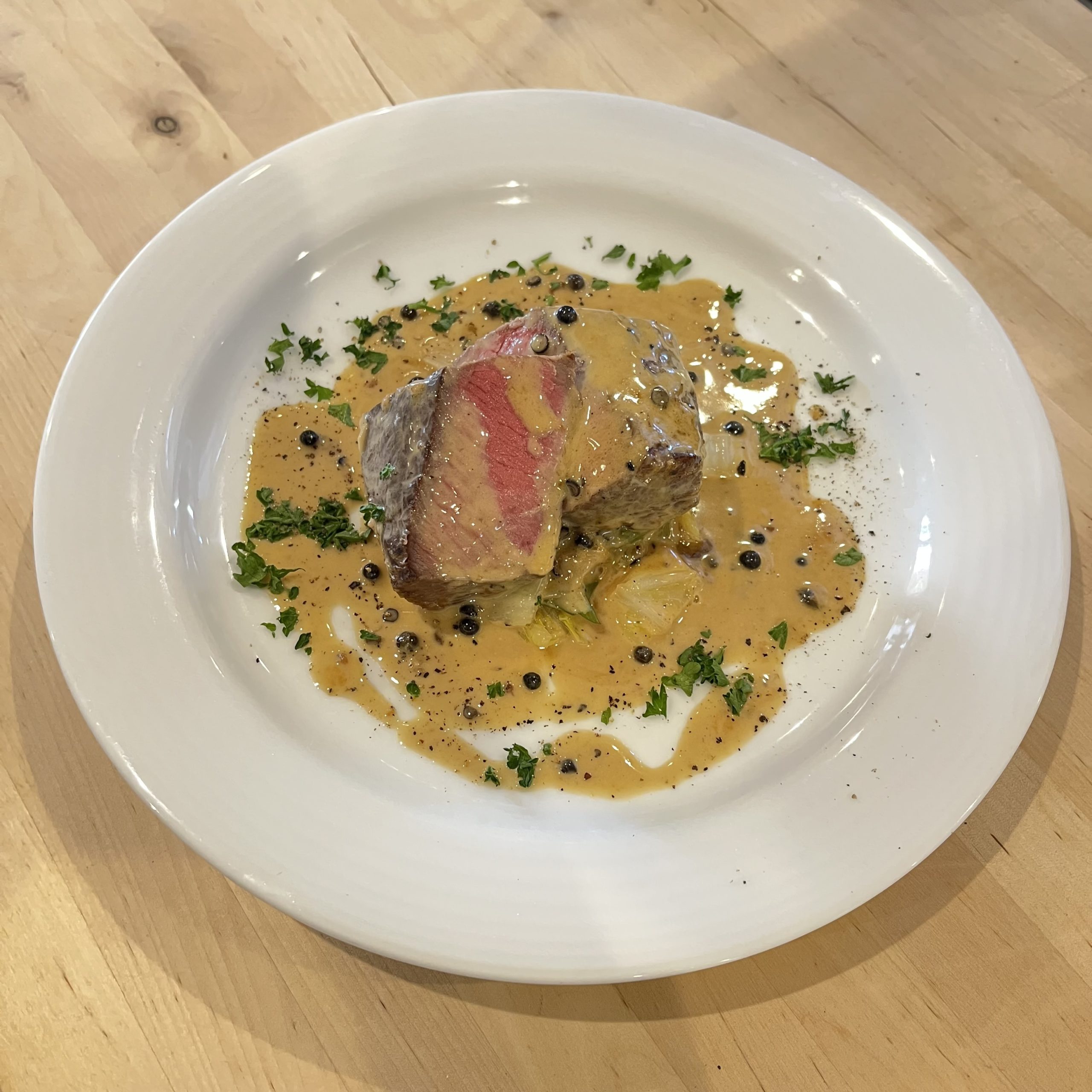 ▼千葉県君津産鹿肉のロースト~生粒コショウ、フォン・ド・ヴォー、生クリームのソース[+300円]