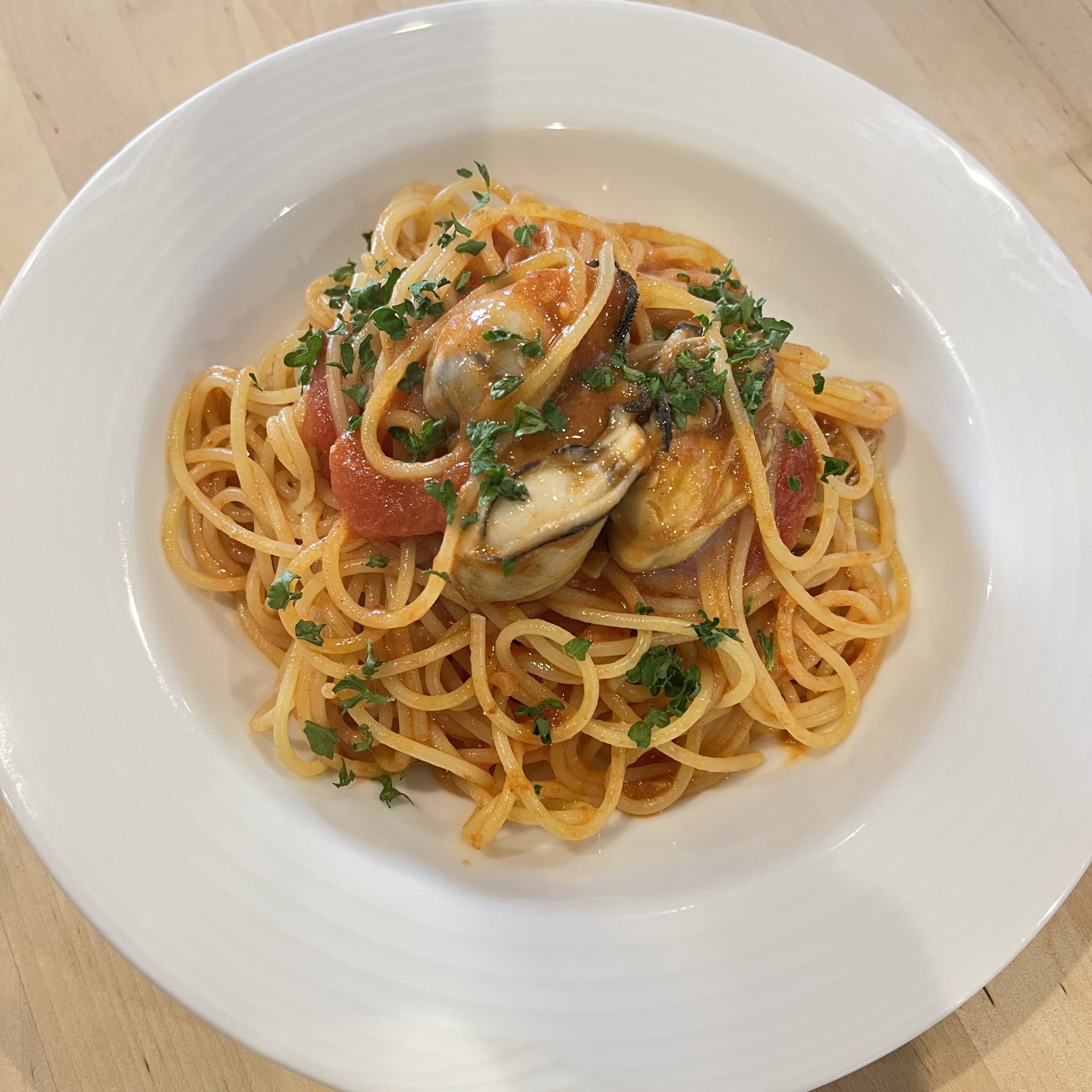 ▼スパゲティ 自家製ロザマリーナ(生しらすの唐辛子漬)と広島県産大粒カキのピリ辛トマトソース[+200円]