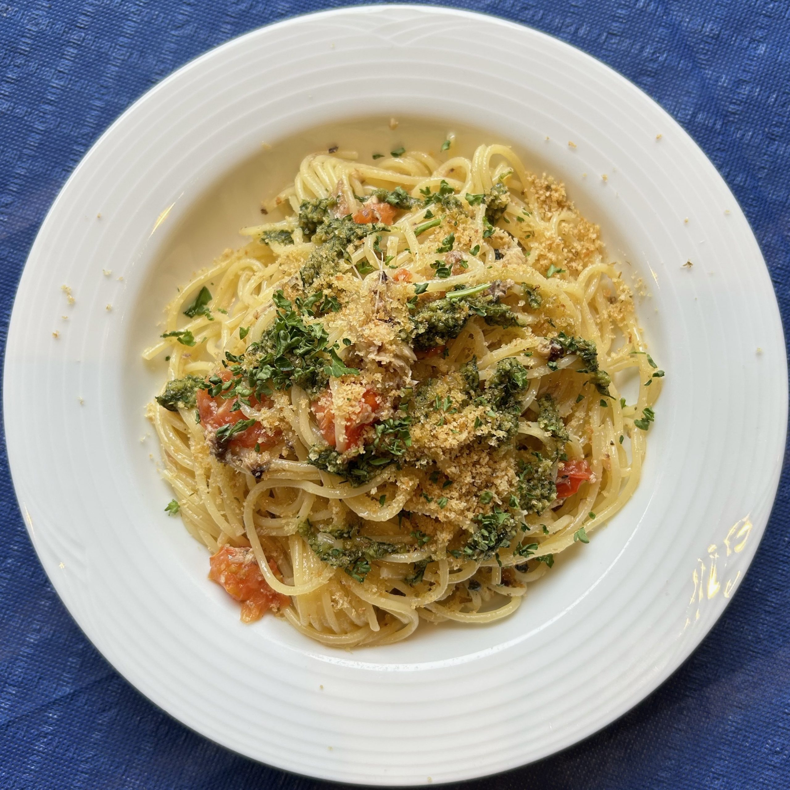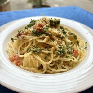 ウイキョウの葉と茎の部分をサッと湯通しし、氷水で冷やして色止め。アーモンド、ニンニク、オリーブオイルで回しペースト状に。爽やかな香りにコクをプラス。サンマのコンフィを潰したパスタと仕上げに炒ったパン粉をかけてシチリア風っぽく仕上げ。