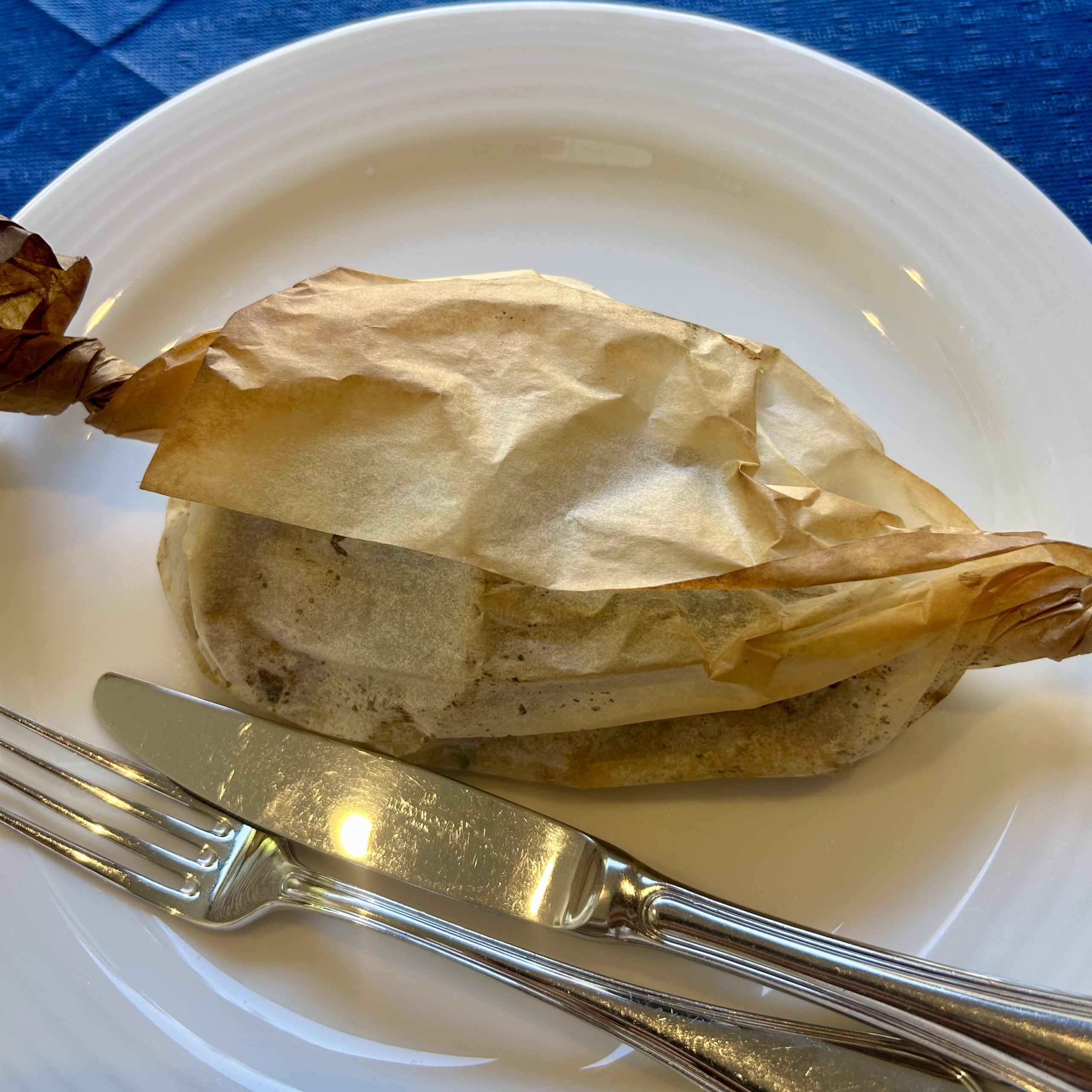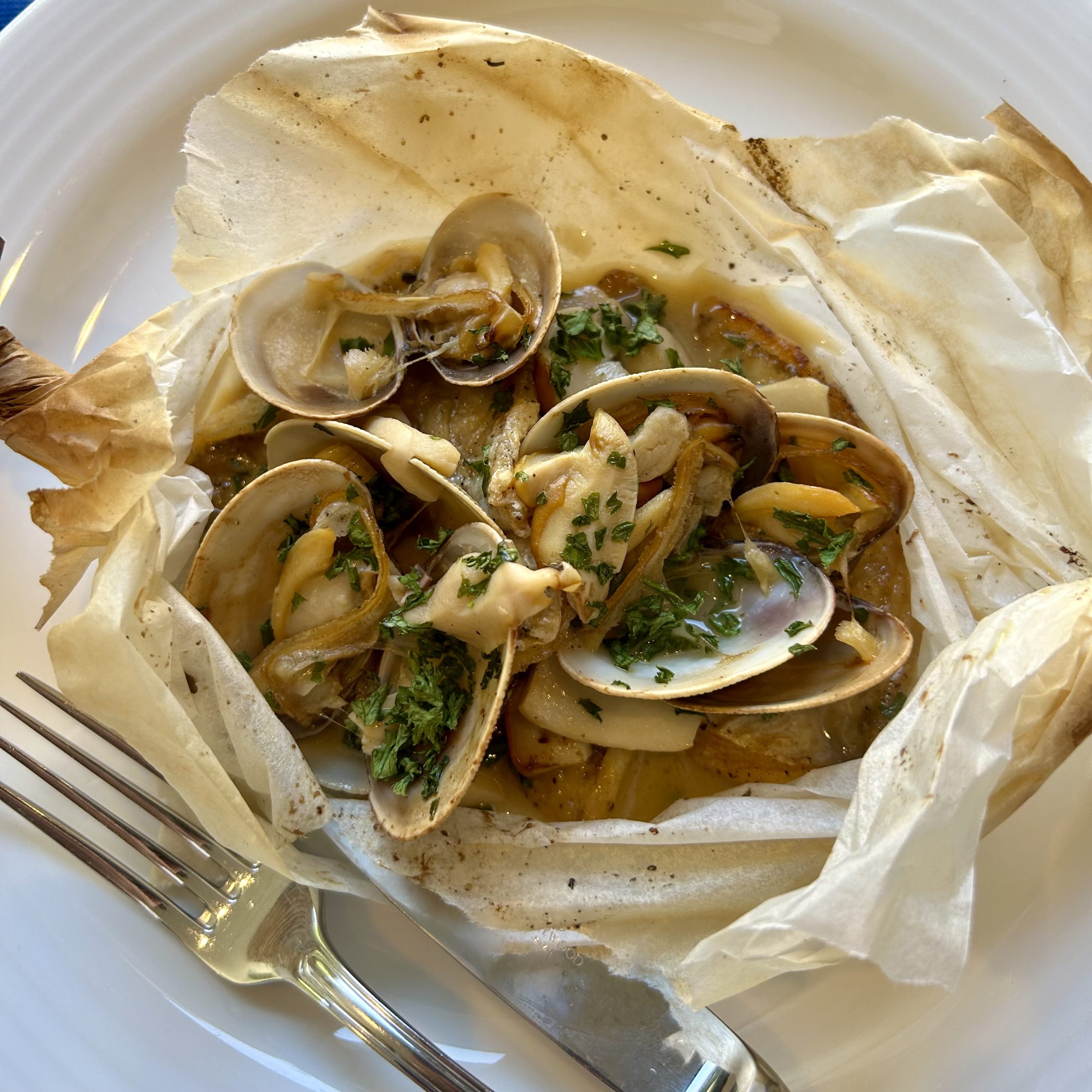 ▼本日の鮮魚と北海道産アサリ、ポルチーニ茸のカルトッチョ(紙包み焼き)