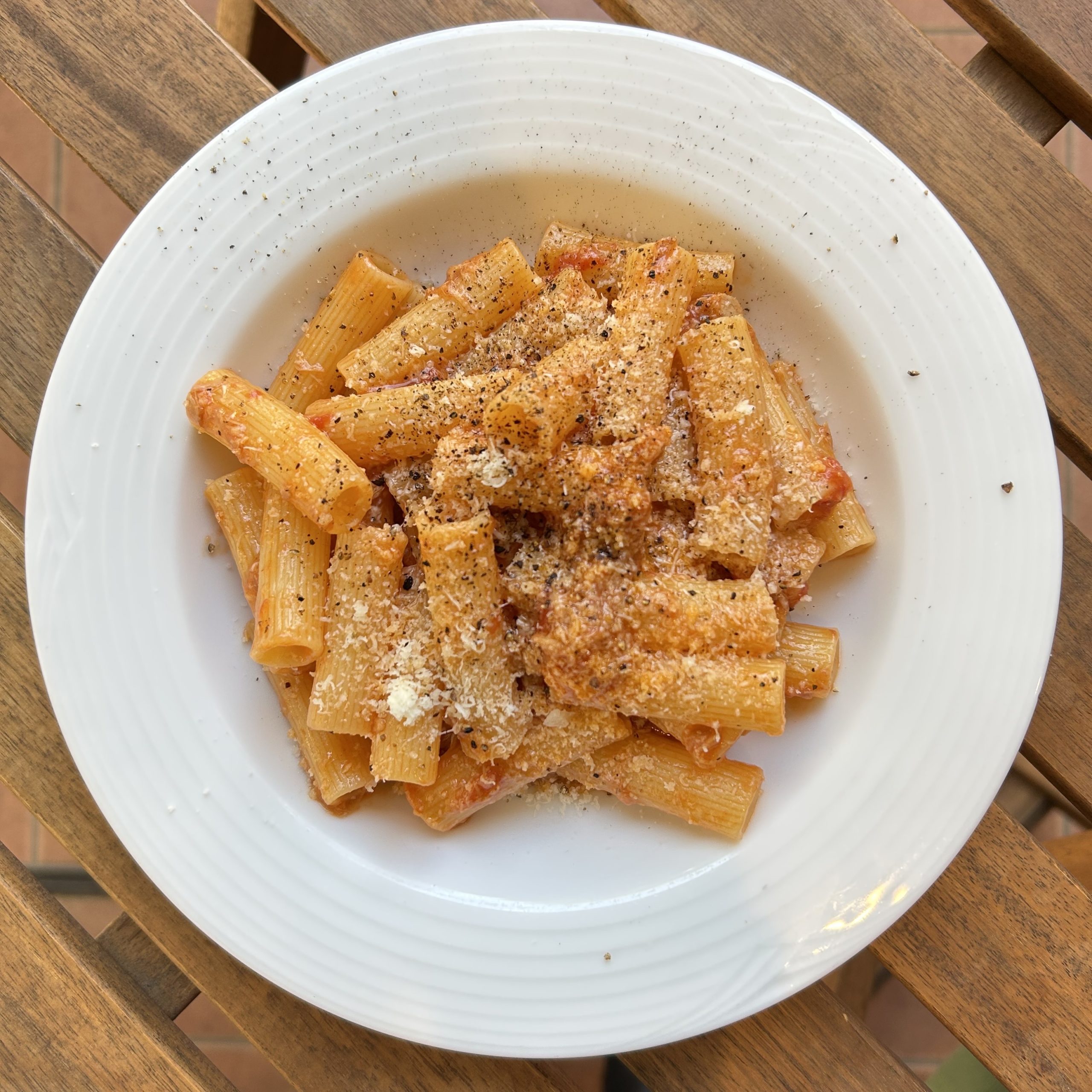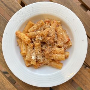 ▼リガトーニ 玉ねぎとキハダマグロの煮込み、ペコリーノチーズ