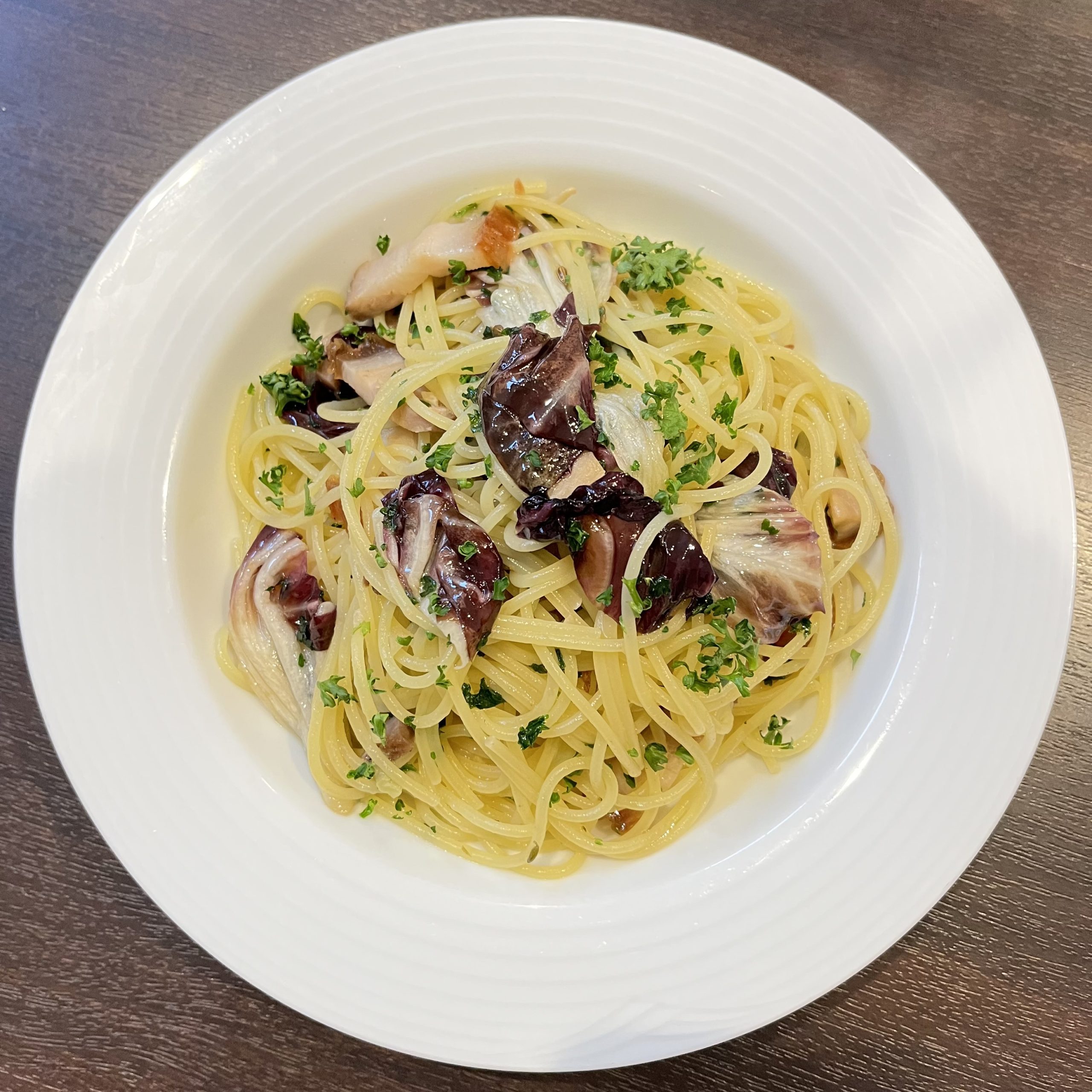 ▼スパゲティ 自家製ポルケッタ(イタリアのローストポーク)とトレビスのアーリオオーリオ