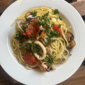 新鮮な魚介類と春になり糖度を上げてきたプチトマトをガーリックオイルでシンプルに。ソースの仕上げにバジルで香り付け。春の訪れを感じるパスタに仕上がっている。