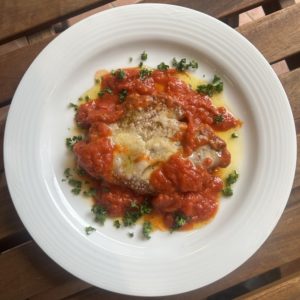 シェフ大好きスペイン産の栗を食べて育ったガリシア栗豚のイタリア風トマトのカツ煮。見た目通りの美味しさ。