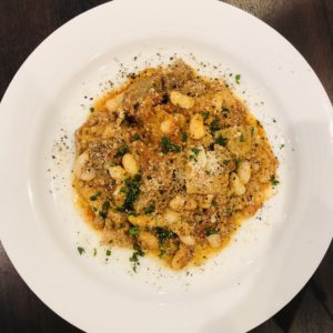▼豚ホルモン(胃、小腸、ホホ)と白インゲン豆のピリ辛トマト煮