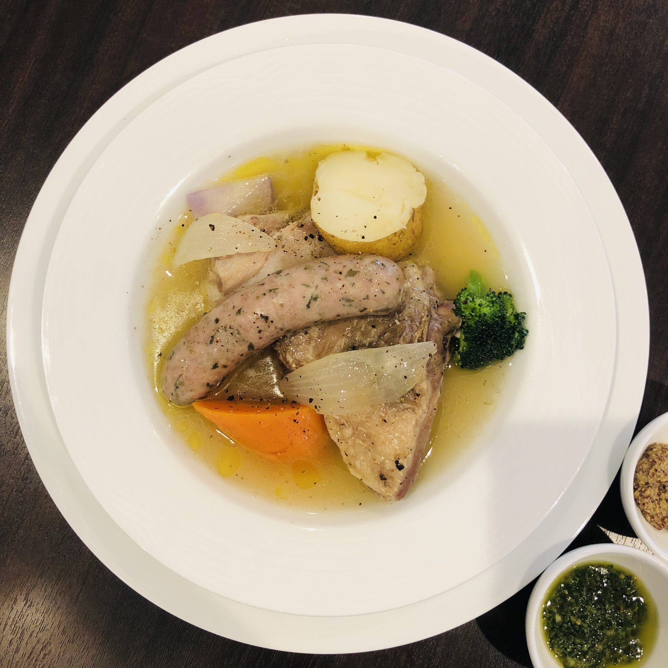 ~骨付きモモ肉(鴨、ホロホロ鳥)、高座豚バラ肉、自家製生ソーセージ、根菜等~