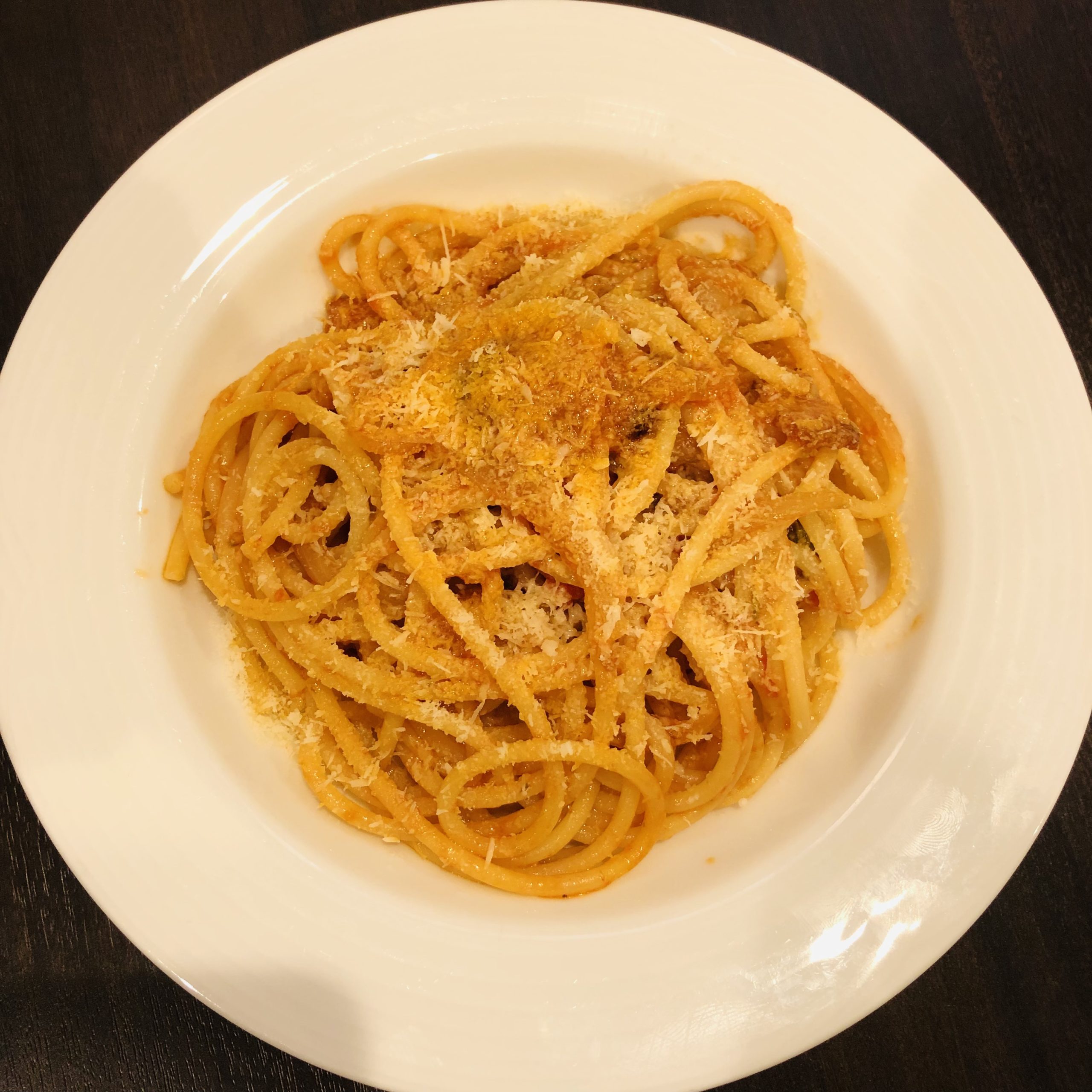 ▼ブガッティーニ 自家製パンチェッタとペコリーノチーズのトマトソース