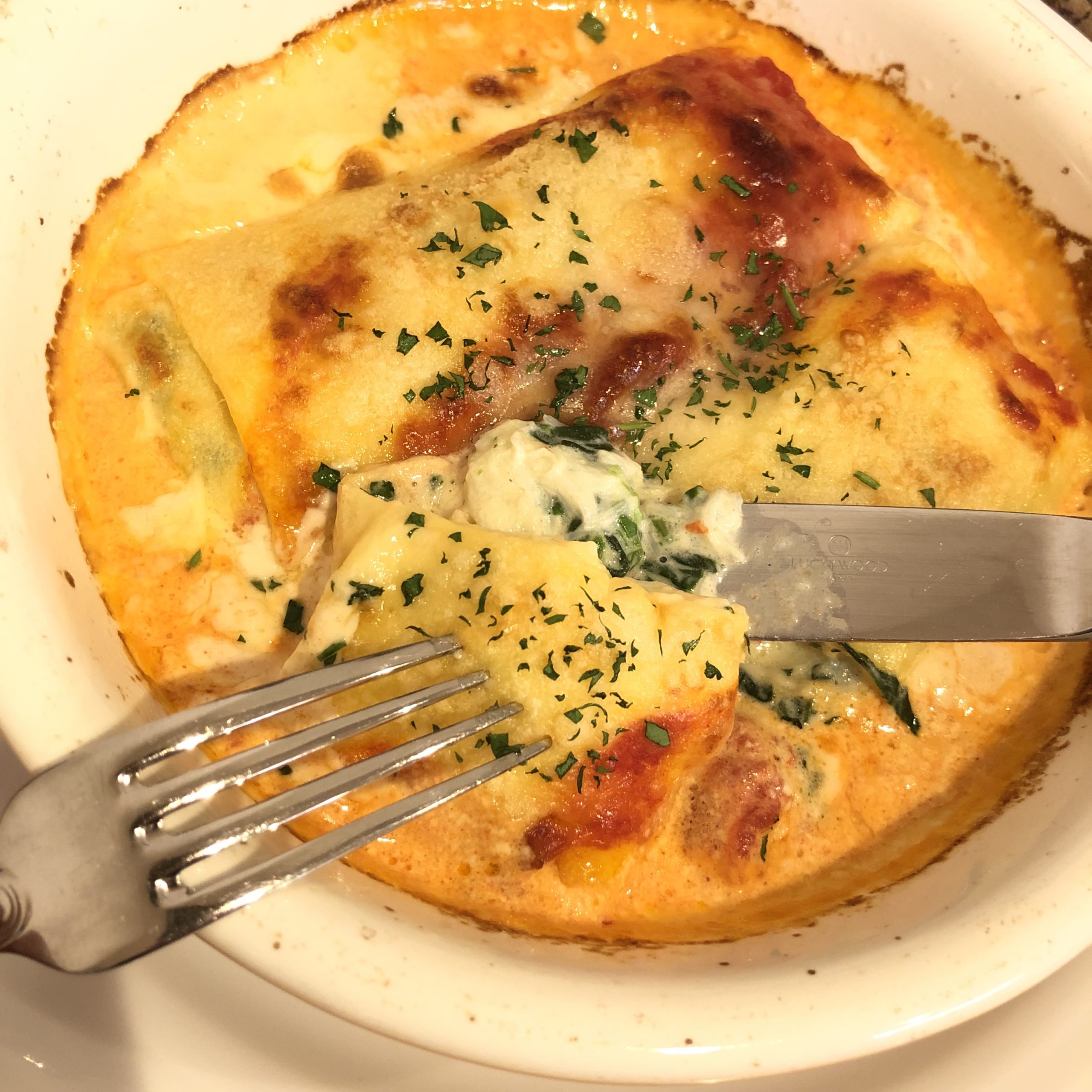 その名も【自家製リコッタチーズとズワイガニ、ほうれん草のクレープ包みオーブン焼き】。