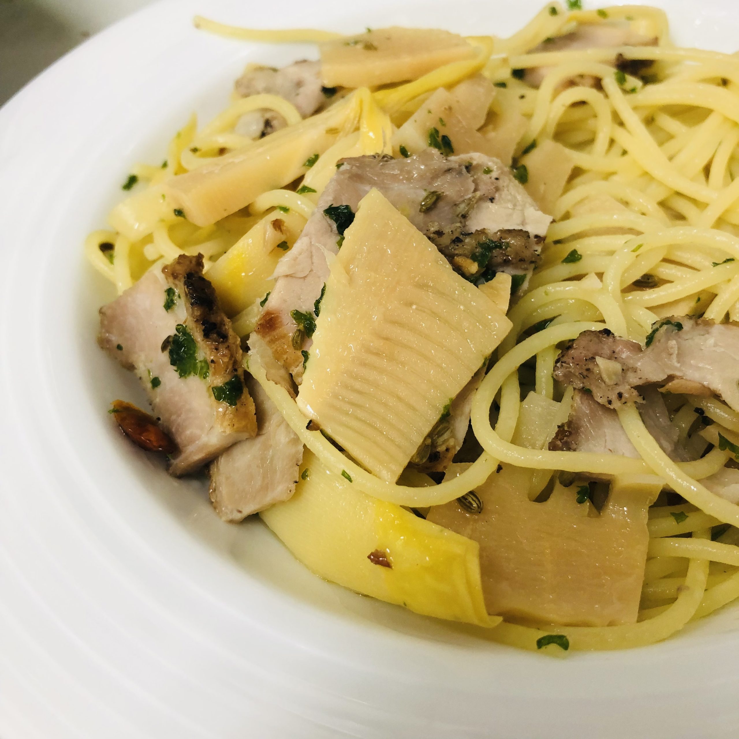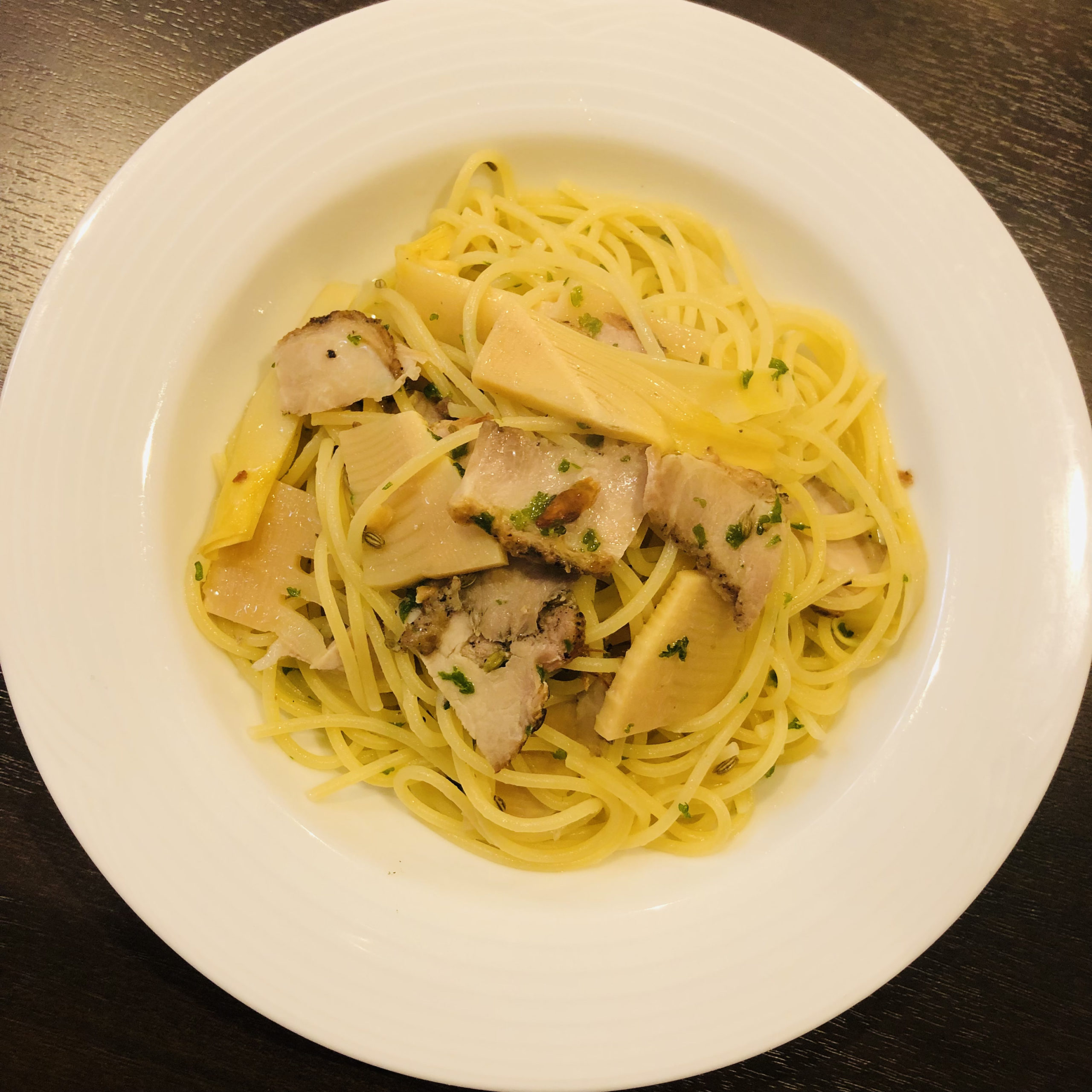 ▼スパゲッティ 自家製ポルケッタ(香草を使った高座豚のロースト)と竹の子のアーリオオーリオ