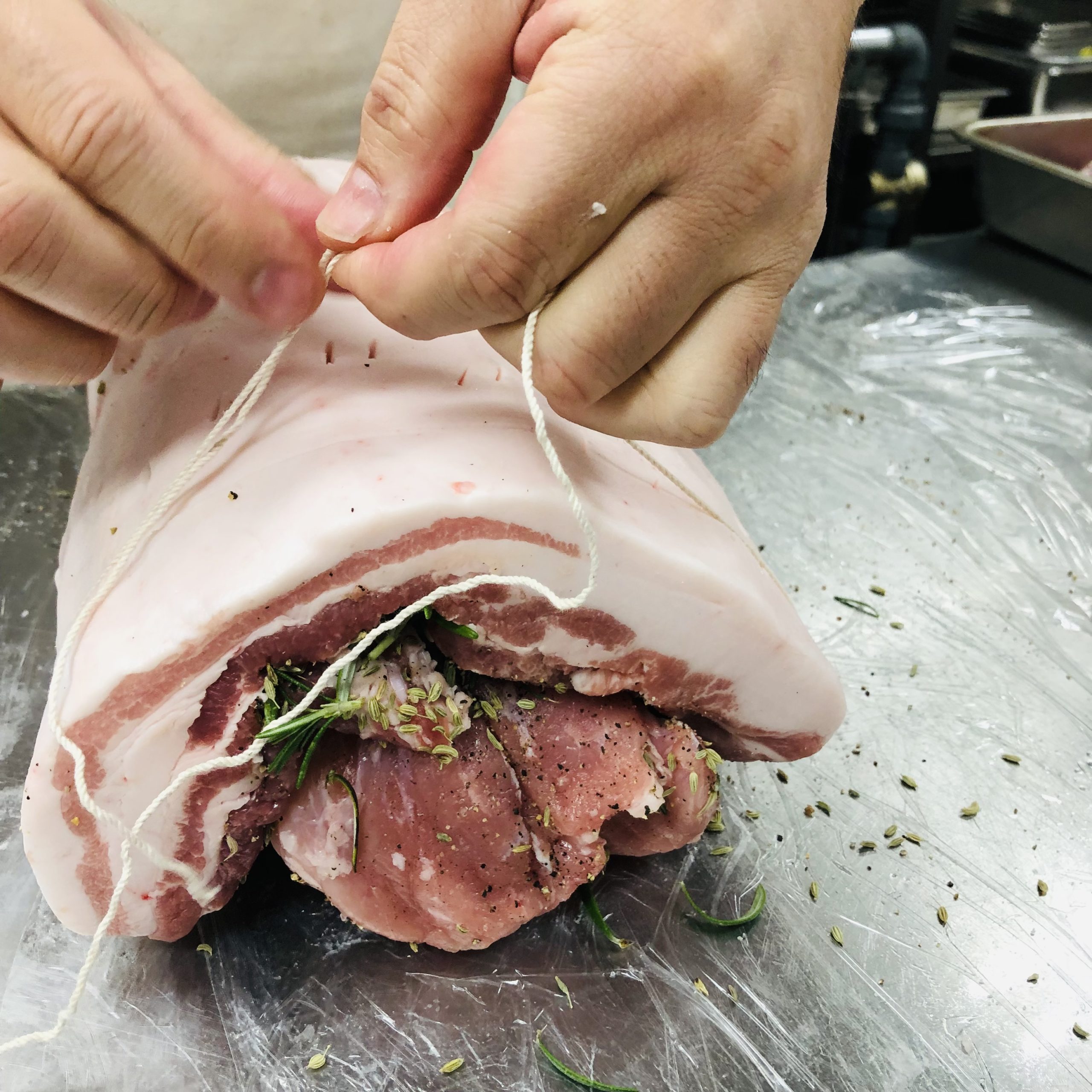 高座豚肉にたっぷり巻き込んだローズマリーとフェンネルの香りが食欲をそそります。