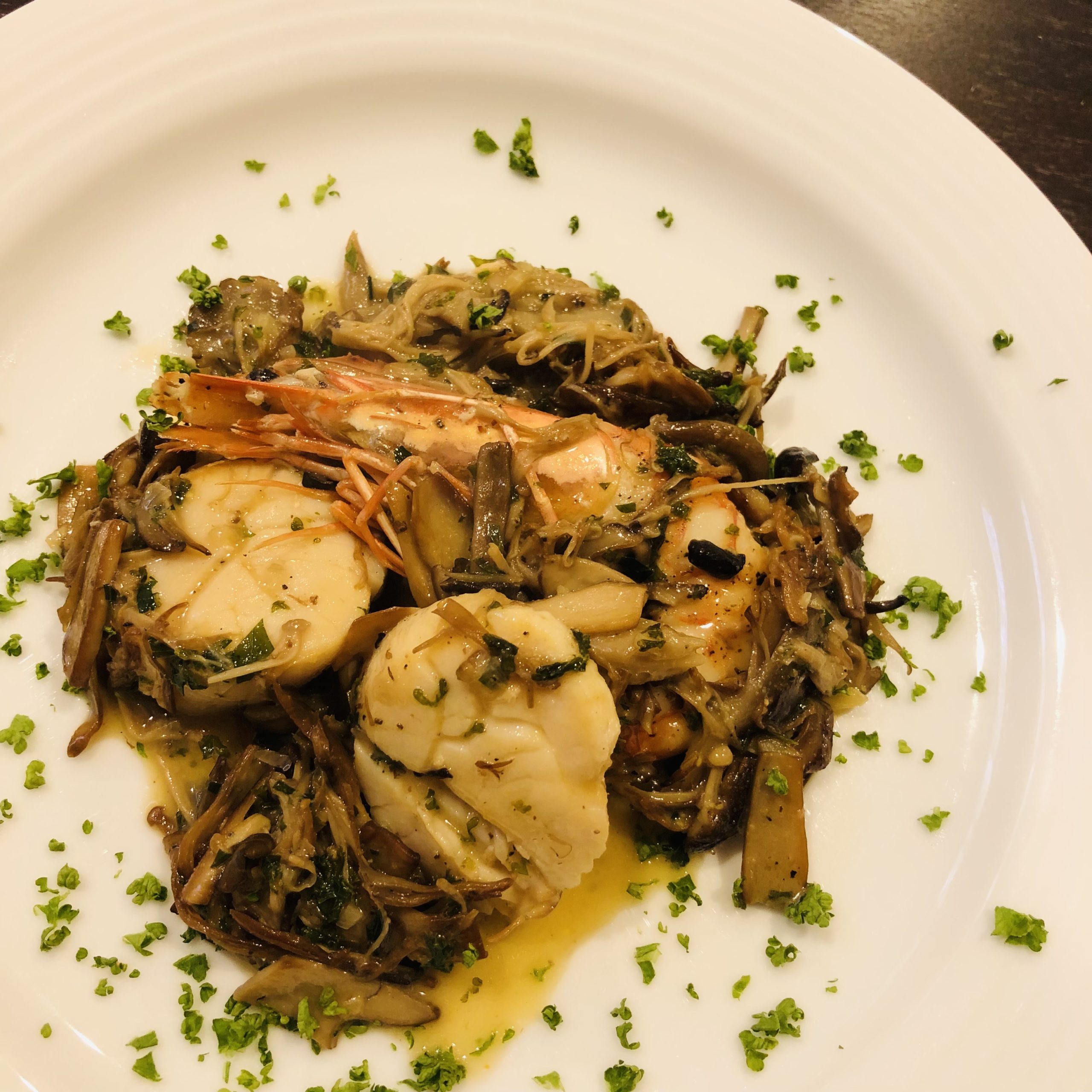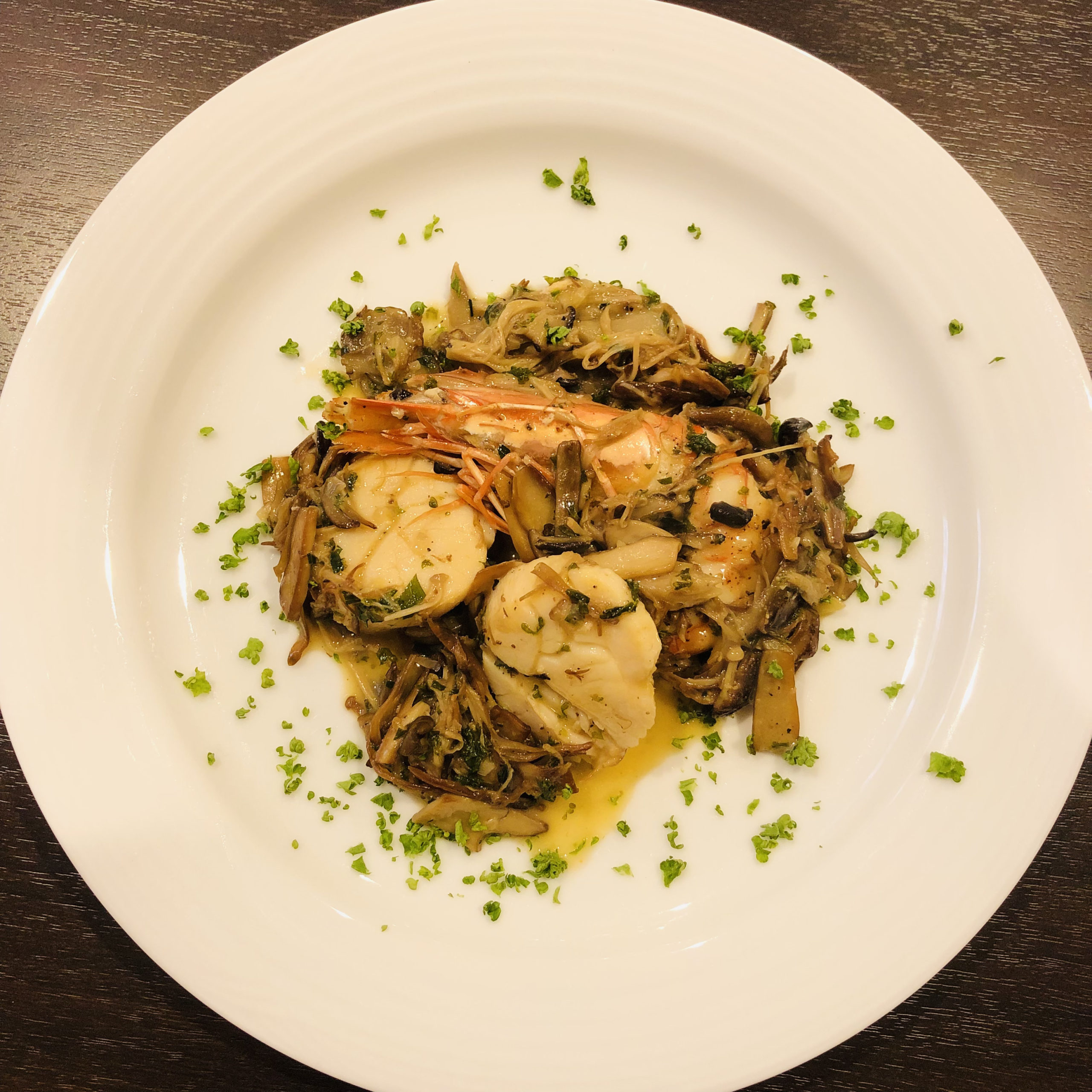 ▼有頭大エビとホタテ、色々きのこのソテー~エスカルゴバター風味