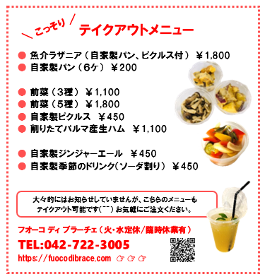 (定番いつものラザニアのテイクアウトは終了しますが、お出しできる場合もございます。ご希望の場合はご相談下さい)
