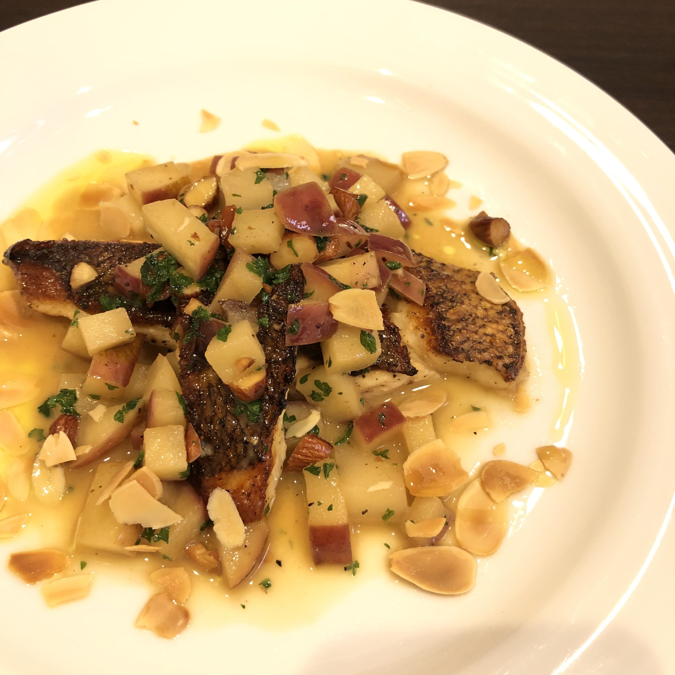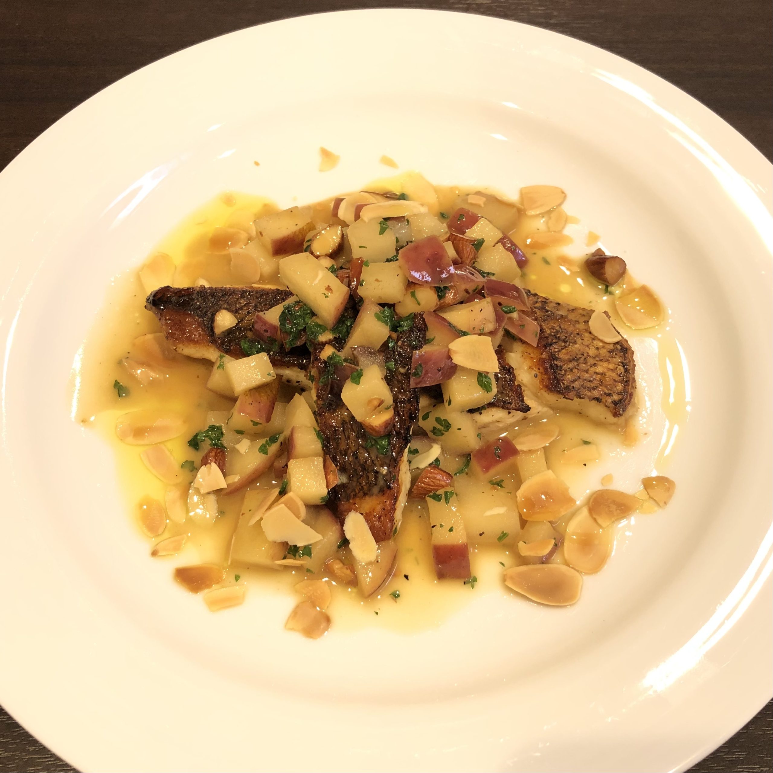 ▼本日の鮮魚のソテー~リンゴとアーモンドのソース(カルヴァドス風味)