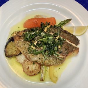 ▼旬のお魚のオーブン焼き~香草風味のガーリックオイル、レモン添え