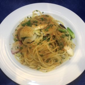 ▼スパゲッティ 自家製マグロのカラスミ(2年熟成)と秋野菜のアーリオオーリオ