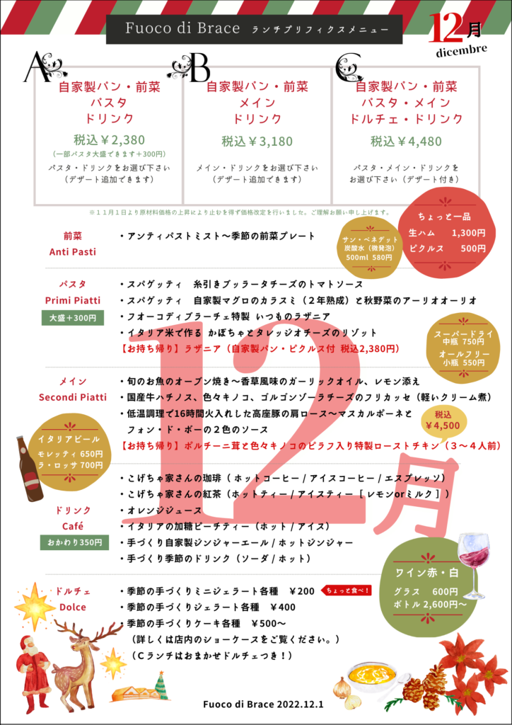 店内メニューはクリスマス限定コースメニューもご用意しますので、こちらもあわせてお楽しみいただければ幸いです。