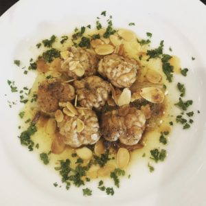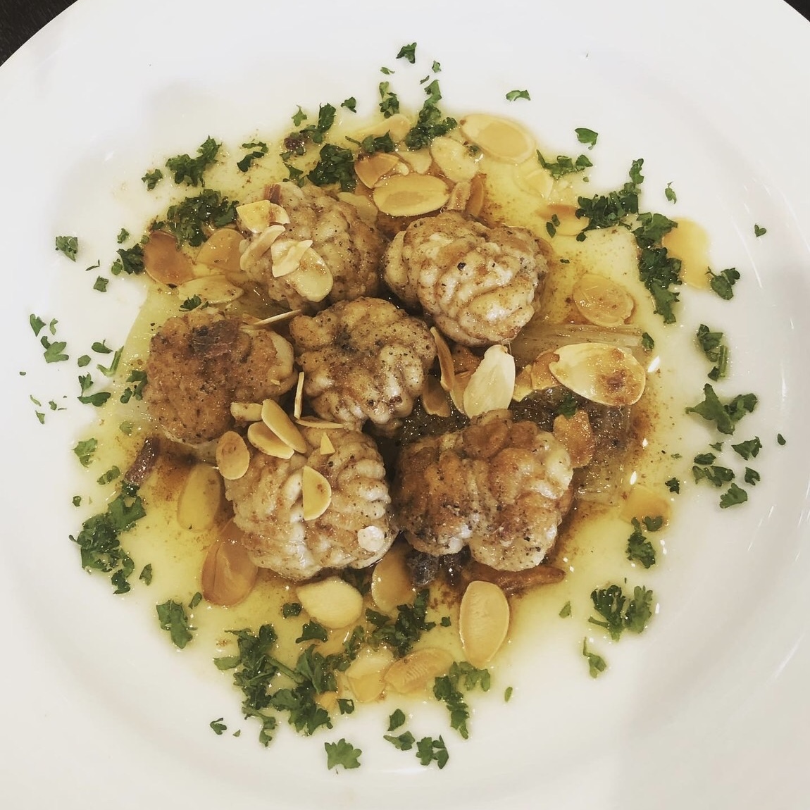 新鮮なタラの白子に粉をまぶしてバターでカリッと焼き上げ、すましバターにアンチョビをとかしたソースで仕上げました。