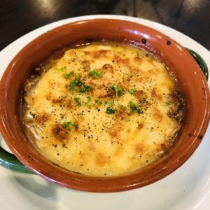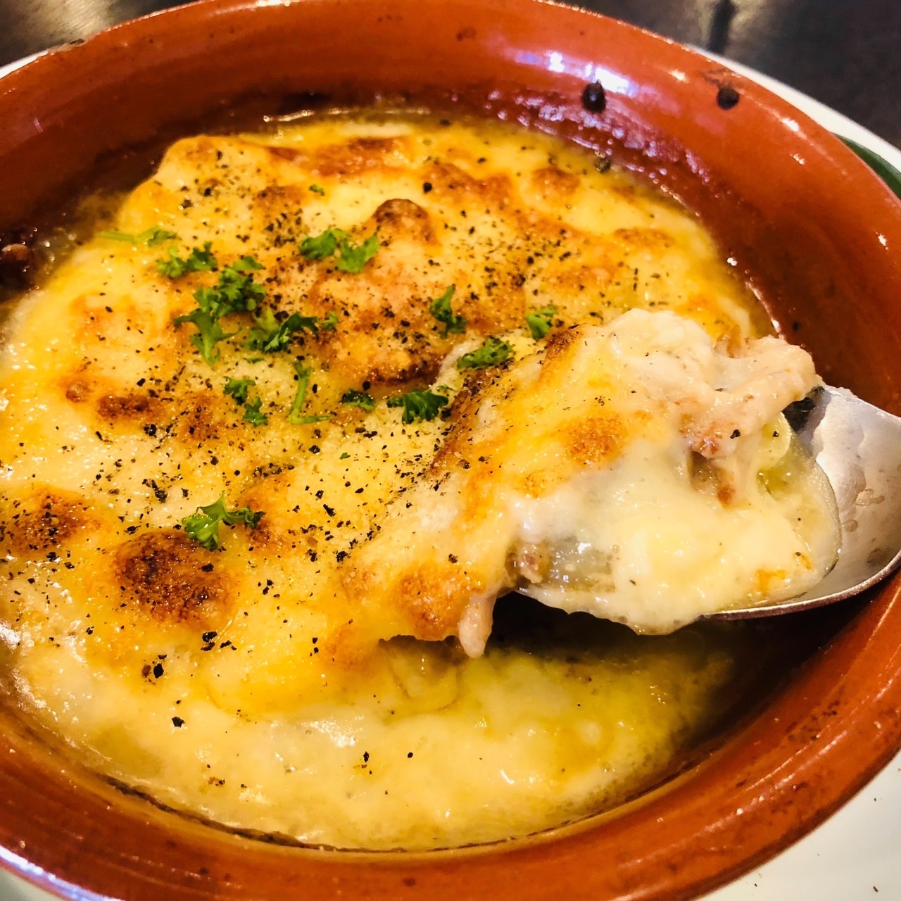 高座豚のバラ肉とバラ軟骨を、香味野菜とお肉の出汁で手でほぐれるまで煮込み、パルミジャーノチーズ入りのマッシュポテトと合わせ、オーブンで焼き上げたお料理。