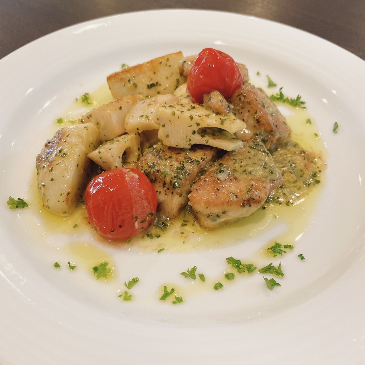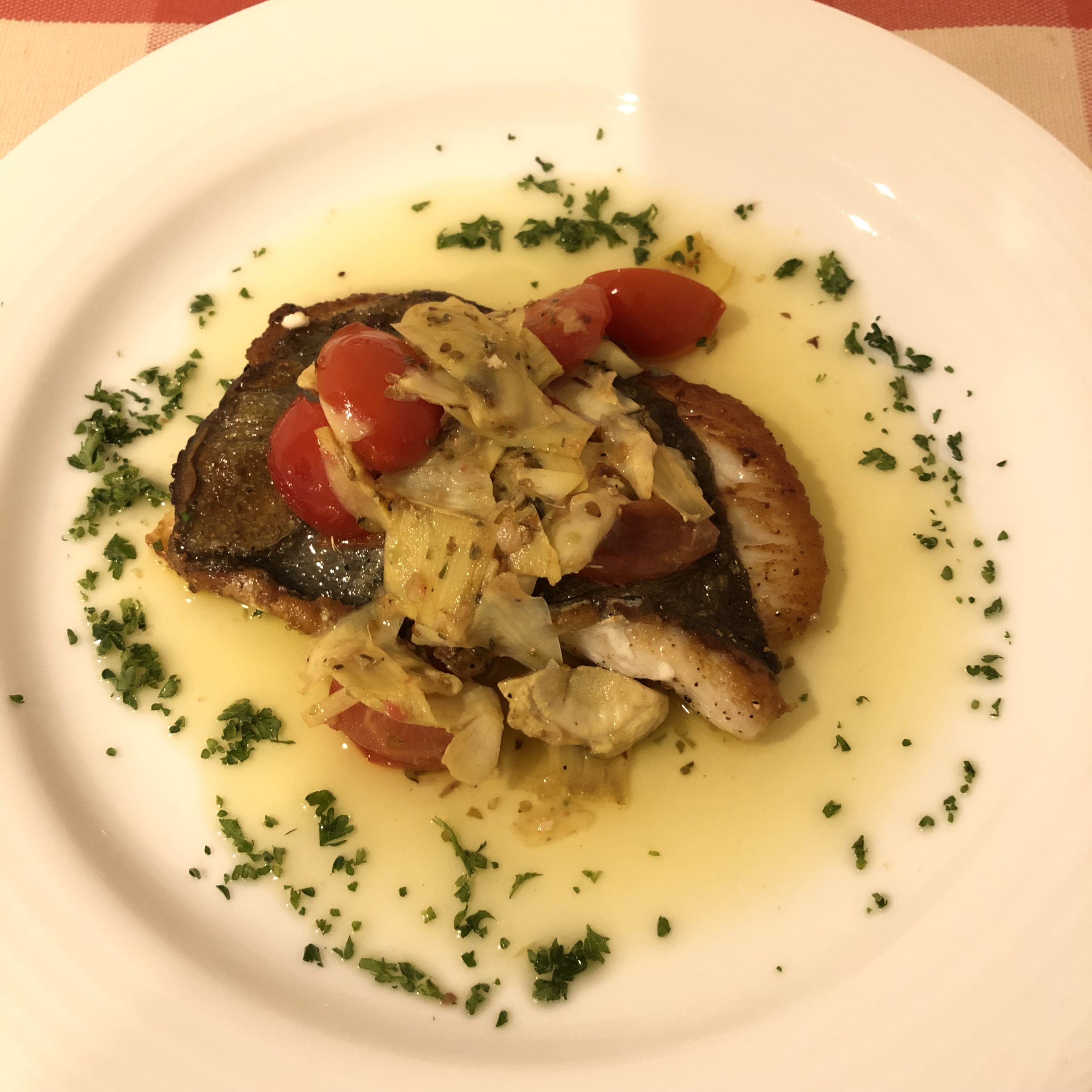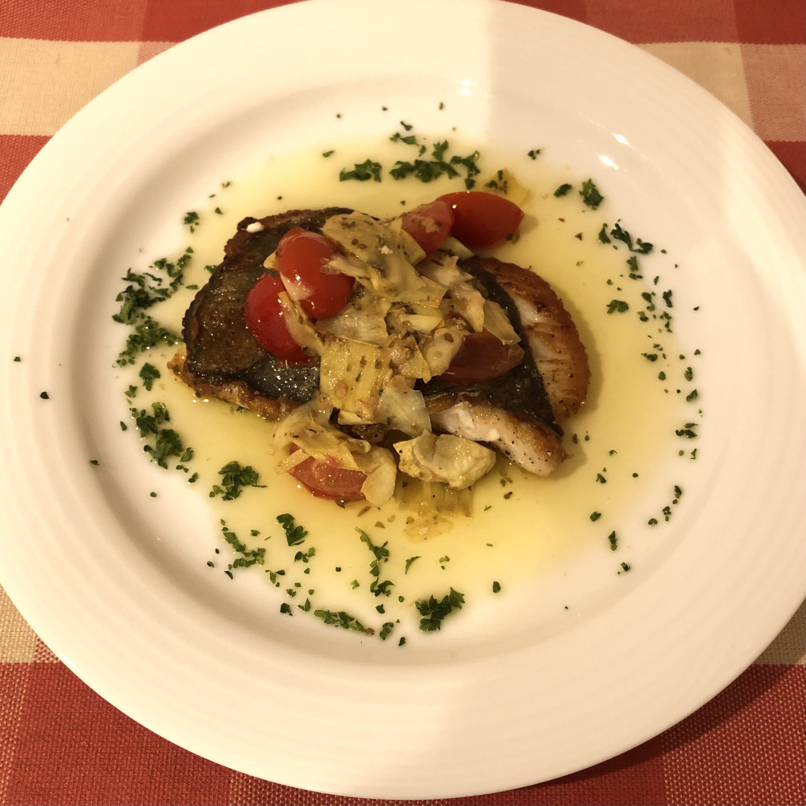 ▼本日の鮮魚のソテー~アーティチョークとフレッシュトマトのオイルソース オレガノ風味