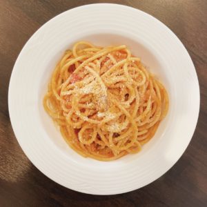 ▼ブガッティーニ アマトリーチェ風~自家製パンチェッタとペコリーノチーズのトマトソース