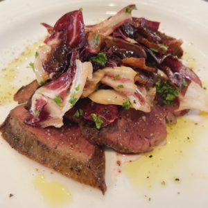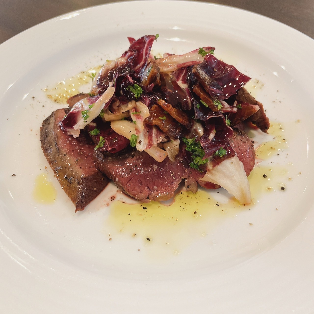 ▼国産牛ハツの炭火焼~自家製パンチェッタとトレビスのサラダ添え